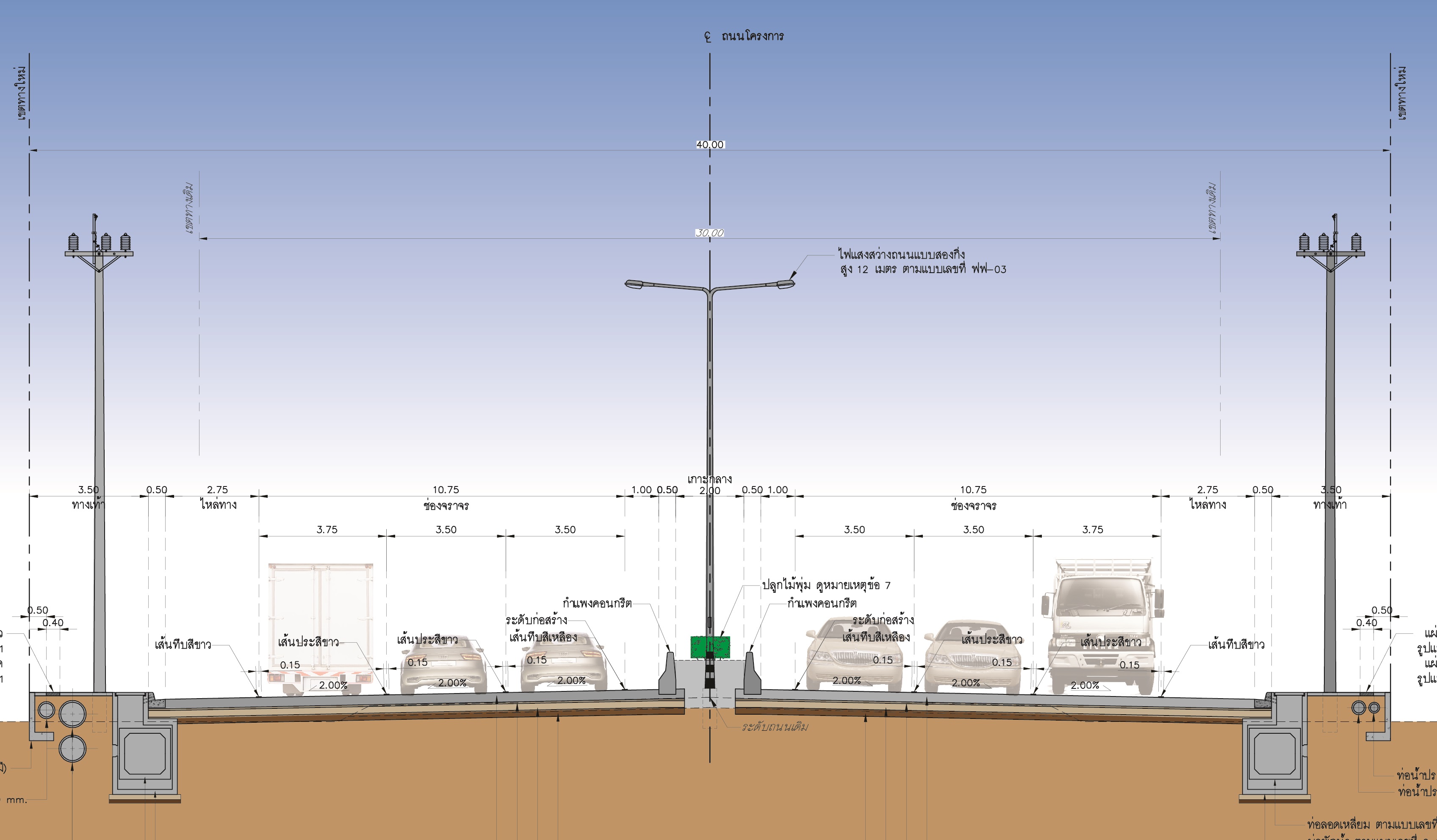 รูปที่ 1 ภาพตัดแนวคิดเบื้องต้นของการพัฒนาโครงการแนวถนนทั่วไป เขตทาง 40 เมตร