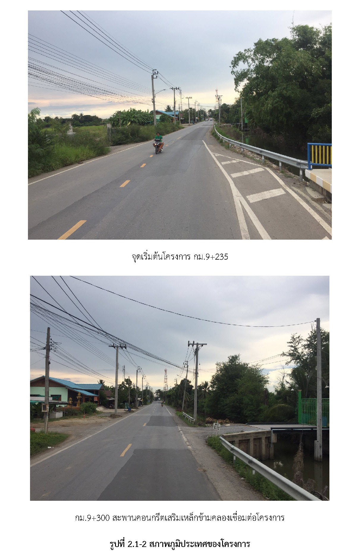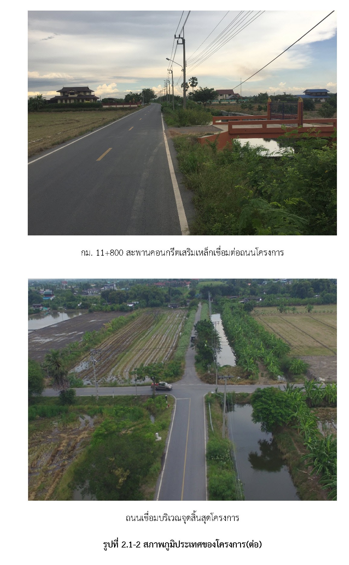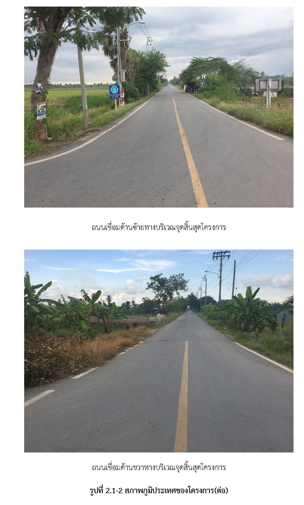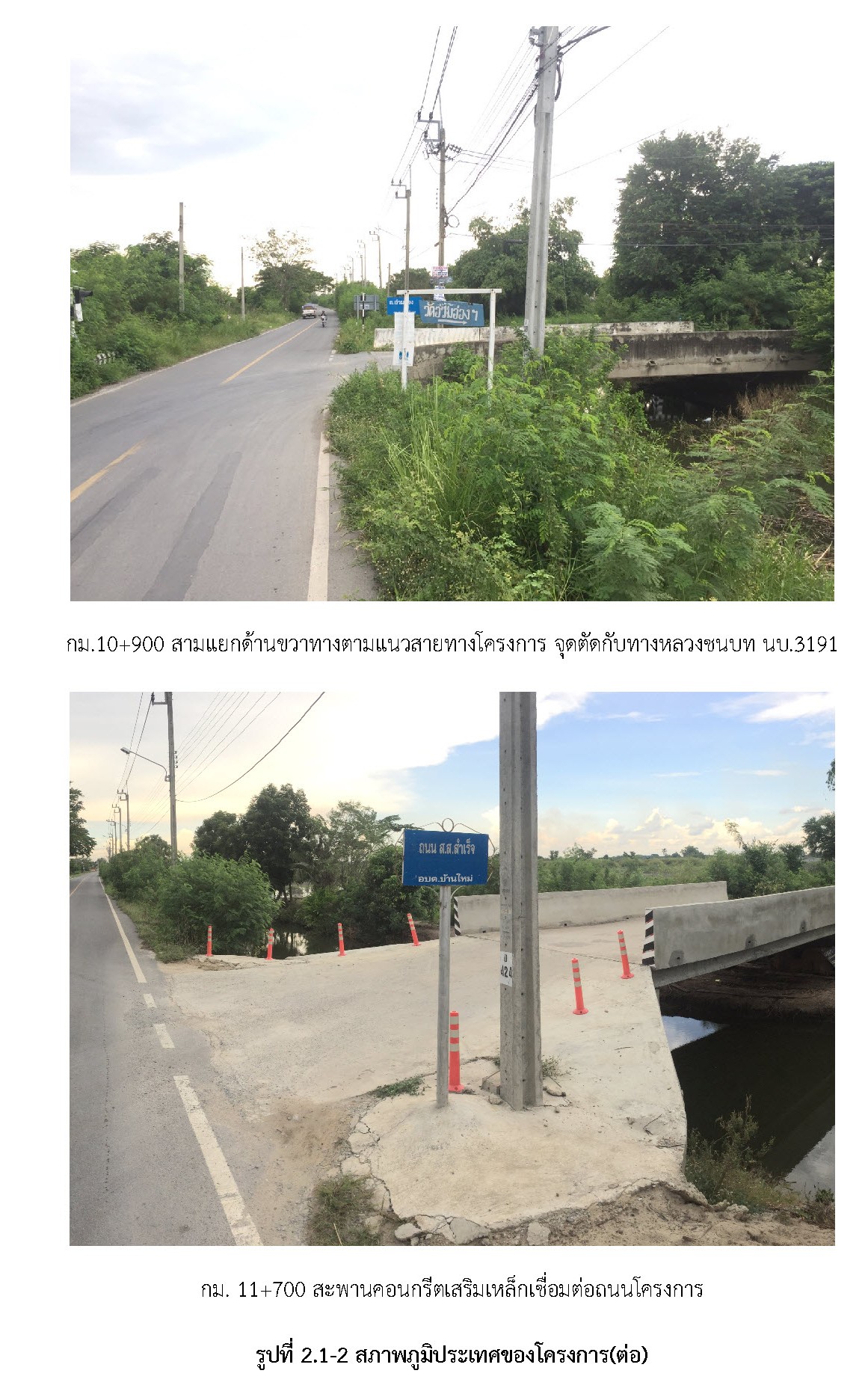 - กม.10+600 - จุดสิ้นสุดโครงการ พื้นที่ส่วนใหญ่ทั้งสองข้างทางจะเป็น พื้นที่ทำการเกษตร และมี ระดับพื้นดินต่ำกว่าระดับถนน ซึ่งส่วนใหญ่จะเป็นนาข้าว และมีบางพื้นที่ เป็นพืชสวน เช่น ทำสวนมะม่วง สวนกล้วย เป็นต้น สภาพเดิมถนนโครงการ มีขนาด 2 ช่องจราจร ความกว้าง 3.00 เมตร ไม่มีไหล่ทาง ผิวทางแอสฟัลติกคอนกรีต ผิวจราจรบางช่วงมีสภาพชำรุดเสียหาย เกิดในลักษณะผิวทางเสียรูป ทรุดตัว