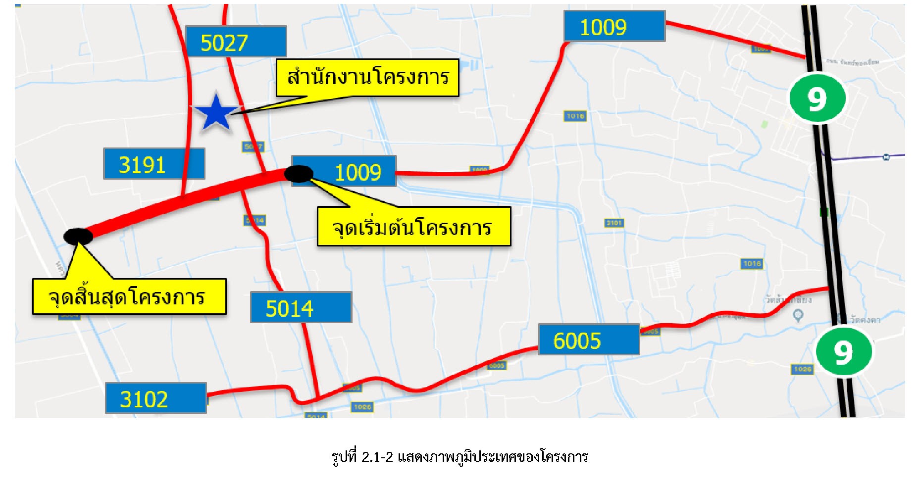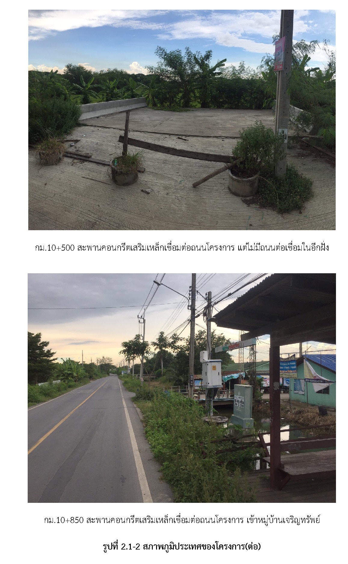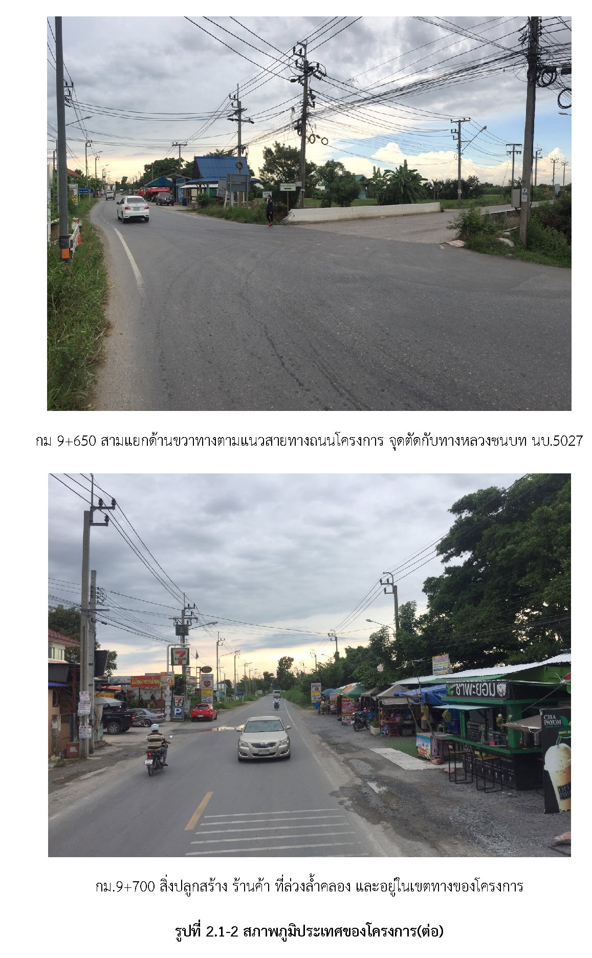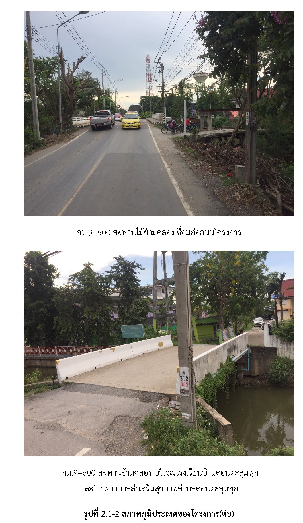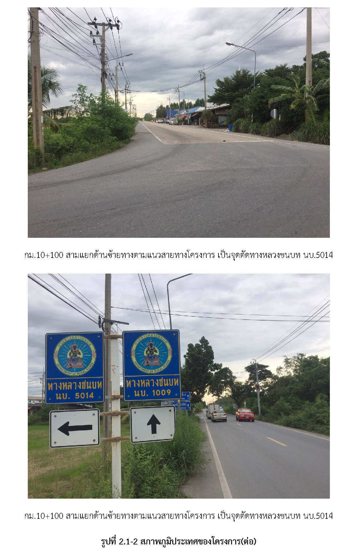 - กม.10+600 - จุดสิ้นสุดโครงการ พื้นที่ส่วนใหญ่ทั้งสองข้างทางจะเป็น พื้นที่ทำการเกษตร และมี ระดับพื้นดินต่ำกว่าระดับถนน ซึ่งส่วนใหญ่จะเป็นนาข้าว และมีบางพื้นที่ เป็นพืชสวน เช่น ทำสวนมะม่วง สวนกล้วย เป็นต้น สภาพเดิมถนนโครงการ มีขนาด 2 ช่องจราจร ความกว้าง 3.00 เมตร ไม่มีไหล่ทาง ผิวทางแอสฟัลติกคอนกรีต ผิวจราจรบางช่วงมีสภาพชำรุดเสียหาย เกิดในลักษณะผิวทางเสียรูป ทรุดตัว