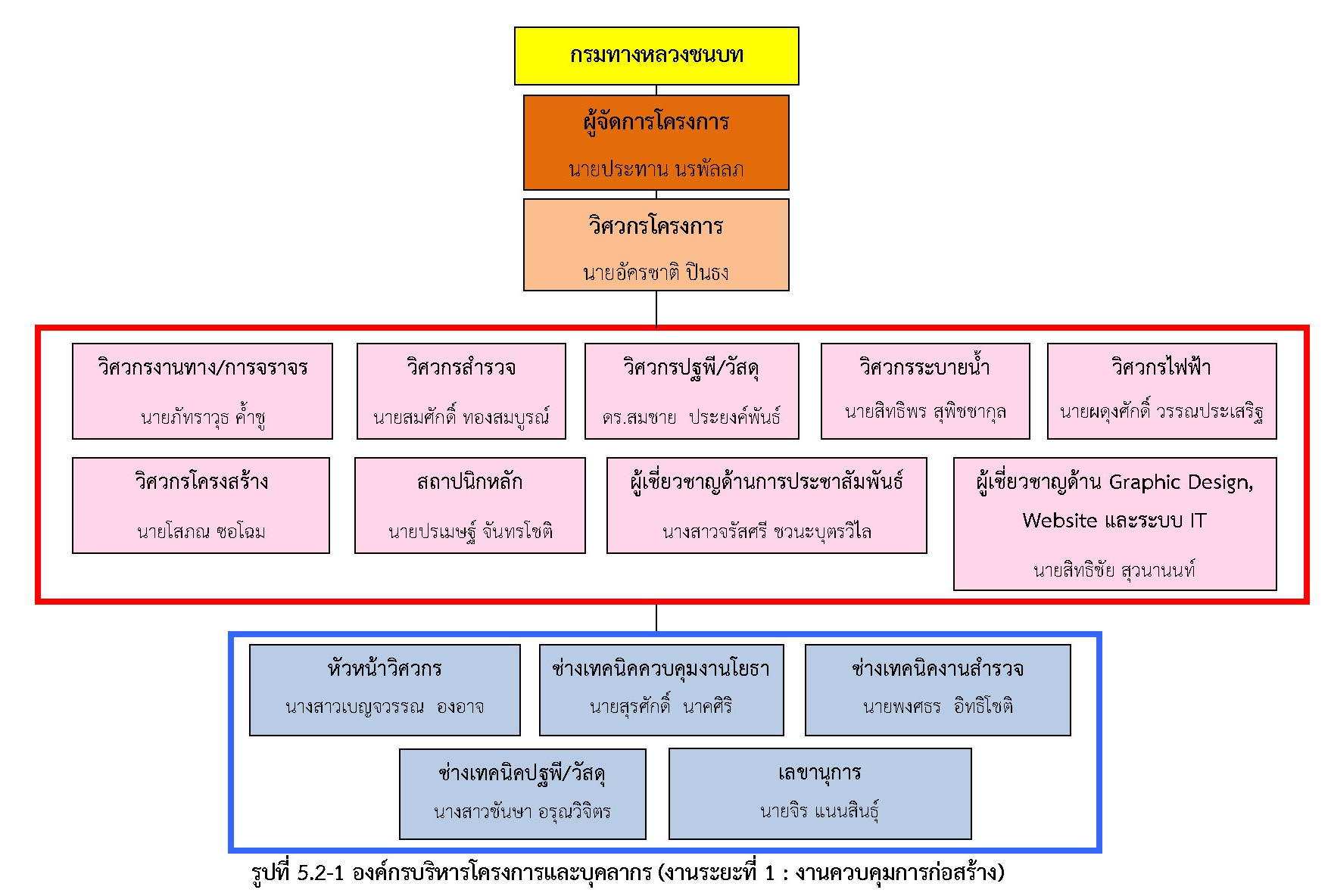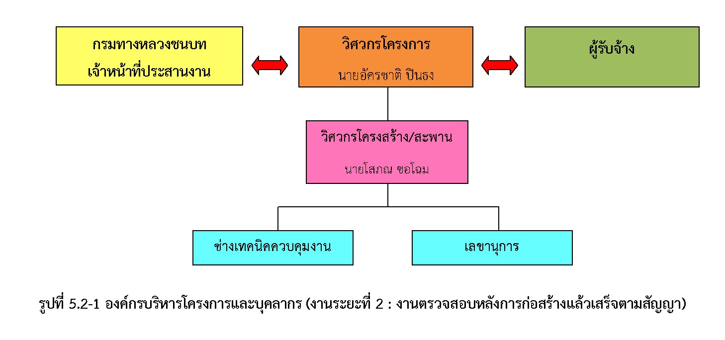 ที่ปรึกษาจัดองค์กรบริหารโครงการตามที่แสดงในแผนภูมิบริหาร ดังรูปที่ 5.2-1แสดงความสัมพันธ์และการประสานงานระหว่างกรมและที่ปรึกษาโดยผู้จัดการโครงการ เป็นการประสานงานระดับบริหาร และผังแสดงถึงความสัมพันธ์ภายในองค์กรการบริหารโครงการระหว่างผู้จัดการโครงการและเจ้าหน้าที่ฝ่ายต่าง ๆ ของโครงการ ซึ่งแบ่งได้เป็น 3 ส่วน ดังนี้