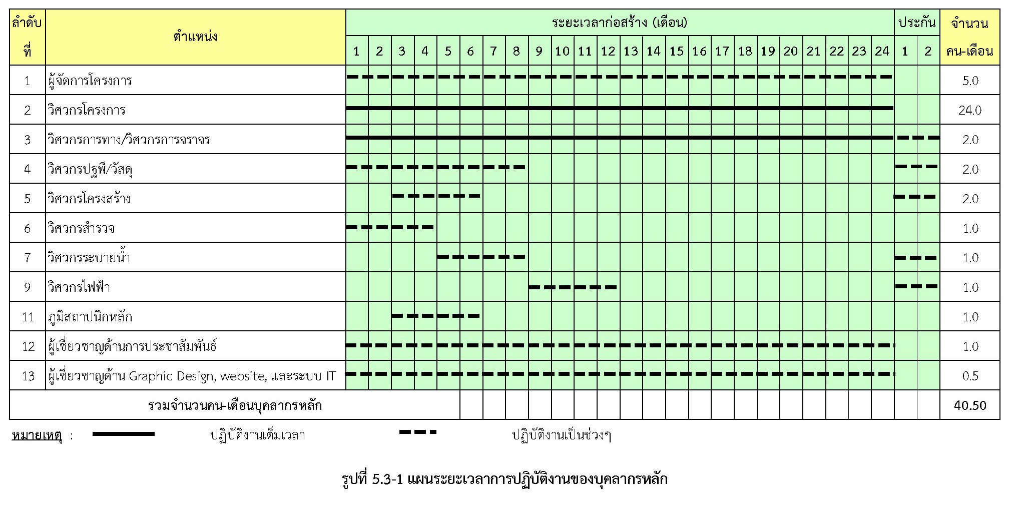 การจัดแผนระยะเวลาทำงานของบุคลากรหลักและบุคลากรสนับสนุนนั้น ได้คำนวณตามความจำเป็นเหมาะสมกับปริมาณงาน ซึ่งทำให้สามารถพิจารณาถึงระยะเวลาที่ต้องการของบุคลากรที่เข้ามาปฏิบัติการในงานนั้นๆ เพื่อให้สอดคล้องกับแผนการดำเนินการ วิธีการดำเนินงาน และหน้าที่ความรับผิดชอบที่บุคลากรได้รับ ที่ปรึกษาจึงได้แสดงแผนระยะเวลาการปฏิบัติงานของบุคลากรหลัก ดังแสดงไว้ในรูปที่ 5.3-1