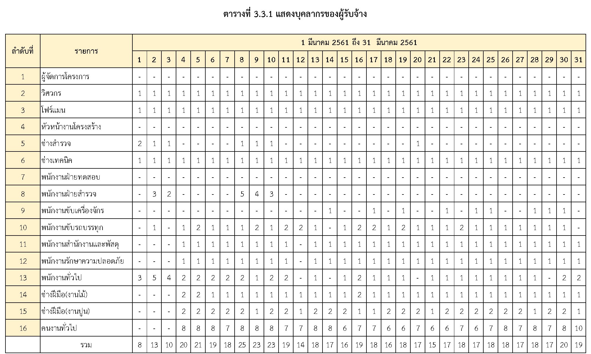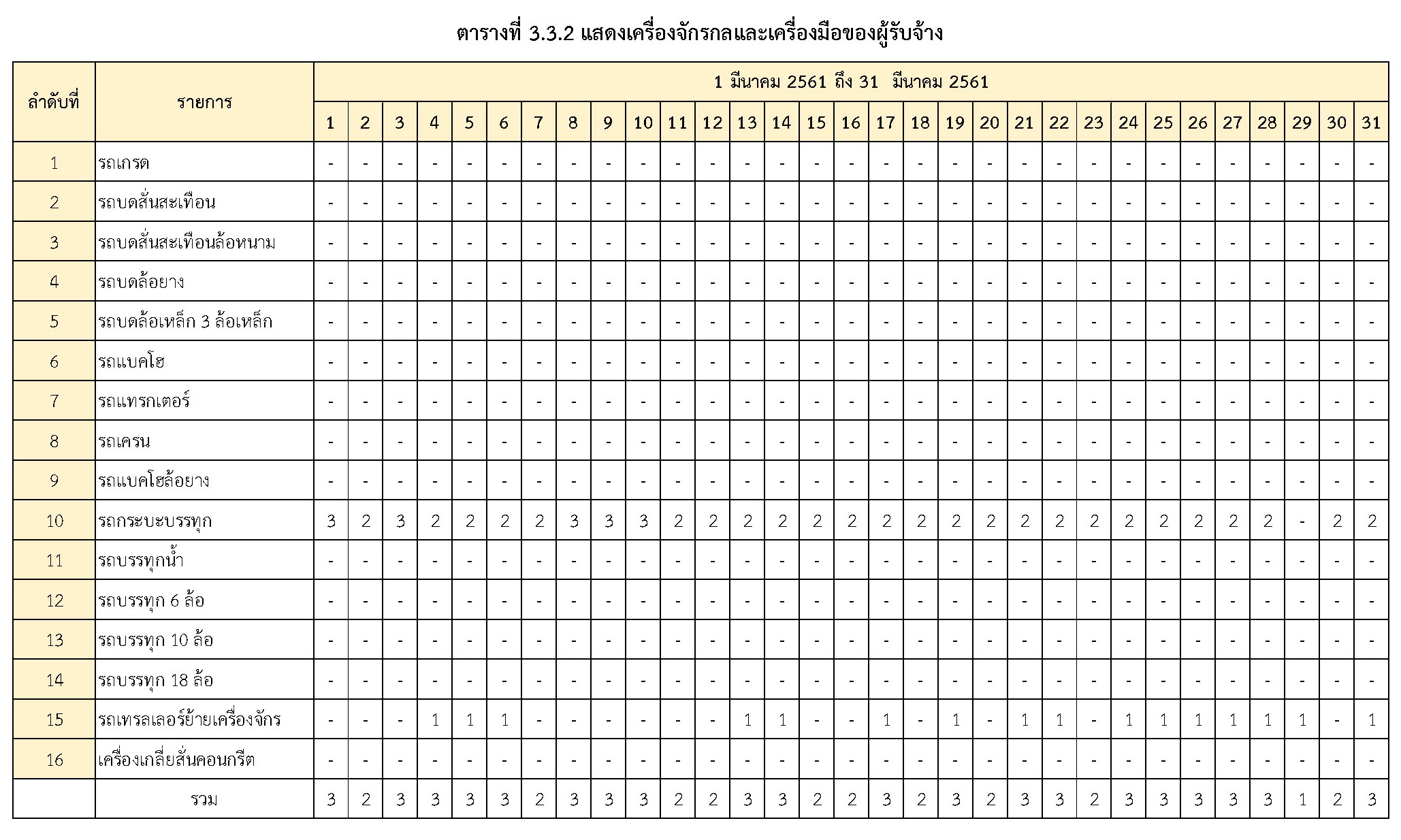 - ระหว่างวันที่ 1 มีนาคม 2561 ถึงวันที่ 31 มีนาคม 2561ผู้รับจ้างได้จัดเครื่องจักรอุปกรณ์ และบุคลากร เพื่อเข้าดำเนินการตามรายละเอียด ตารางที่ 3.3.1 และตารางที่ 3.3.2