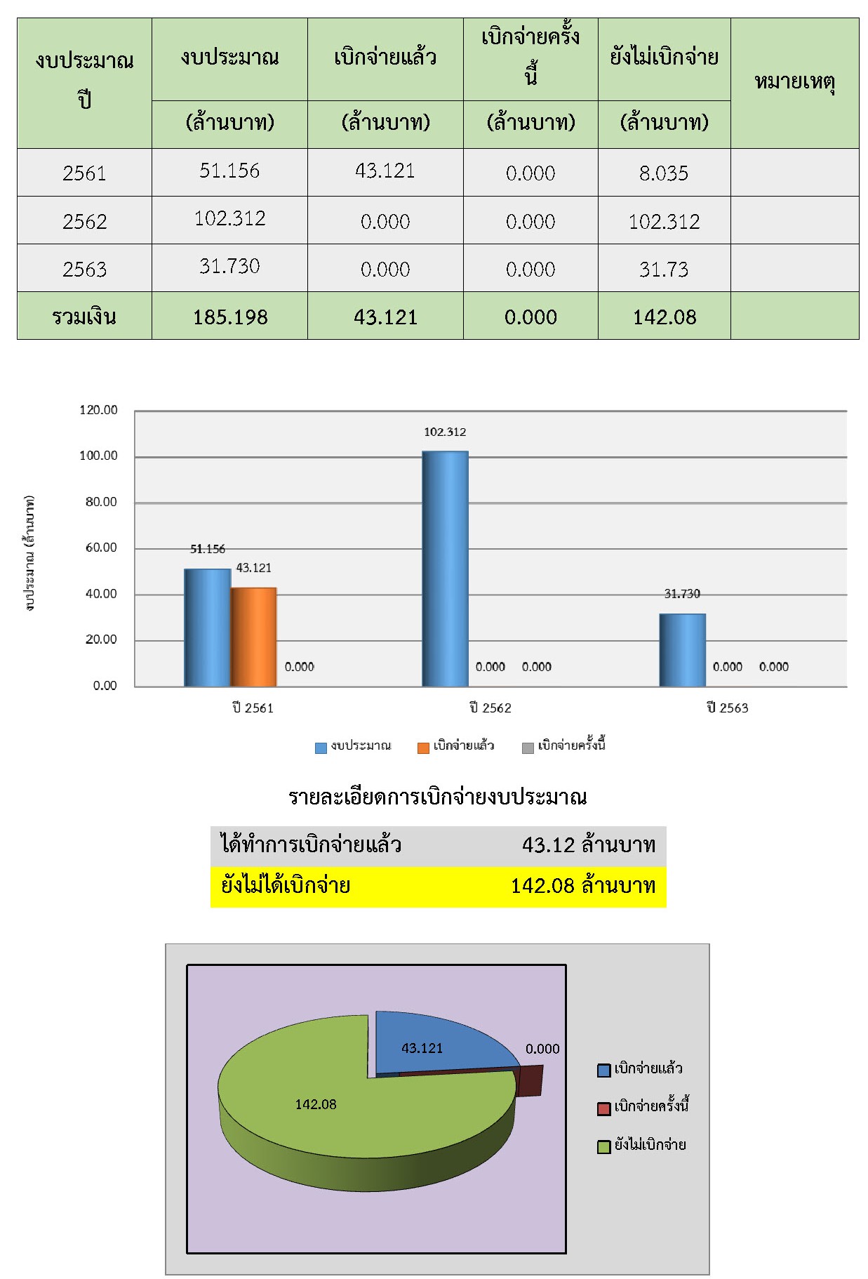 งบประมาณก่อสร้างทั้งหมด 185,198,000.-บาท ปีงบประมาณ 2561 เป็นเงิน 51,156,000.-บาท ปีงบประมาณ 2562 เป็นเงิน 102,312,000.-บาท ปีงบประมาณ 2563 เป็นเงิน31,730,000.-บาท