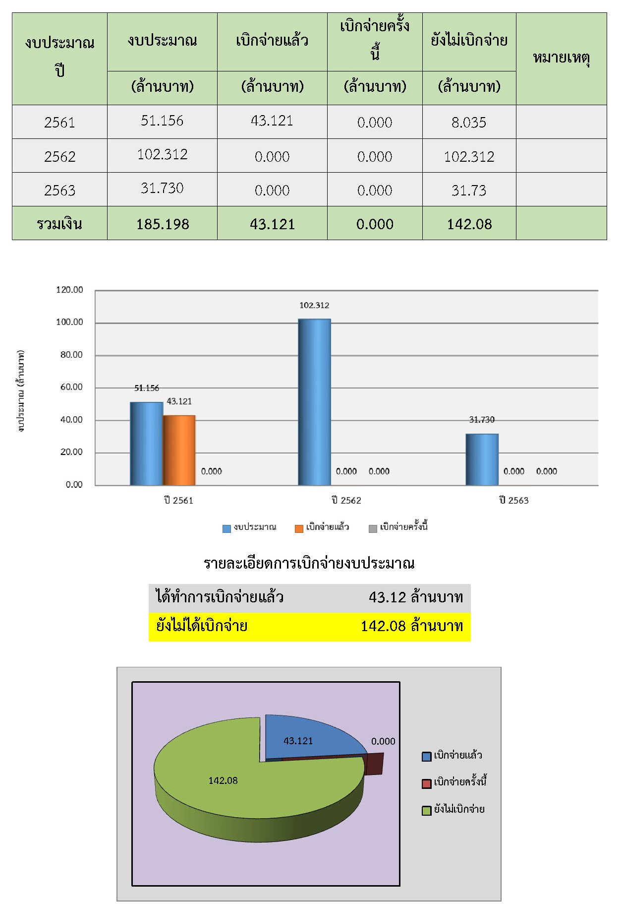งบประมาณก่อสร้างทั้งหมด 185,198,000.-บาท ปีงบประมาณ 2561 เป็นเงิน 51,156,000.-บาท ปีงบประมาณ 2562 เป็นเงิน 102,312,000.-บาท ปีงบประมาณ 2563 เป็นเงิน31,730,000.-บาท