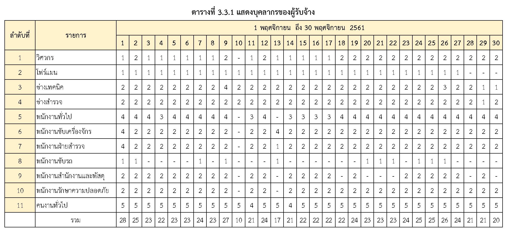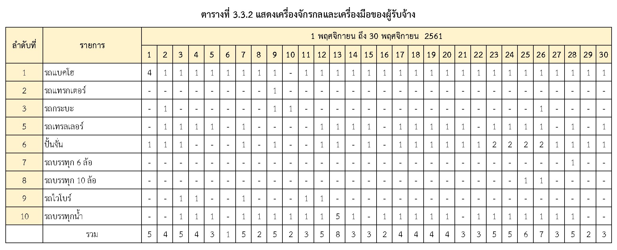 - ระหว่างวันที่ 1 พฤศจิกายน 2561 ถึงวันที่ 30 พฤศจิกายน 2561ผู้รับจ้างได้จัดเครื่องจักรอุปกรณ์ และบุคลากร เพื่อเข้าดำเนินการตามรายละเอียด ตารางที่ 3.3.1 และตารางที่ 3.3.2