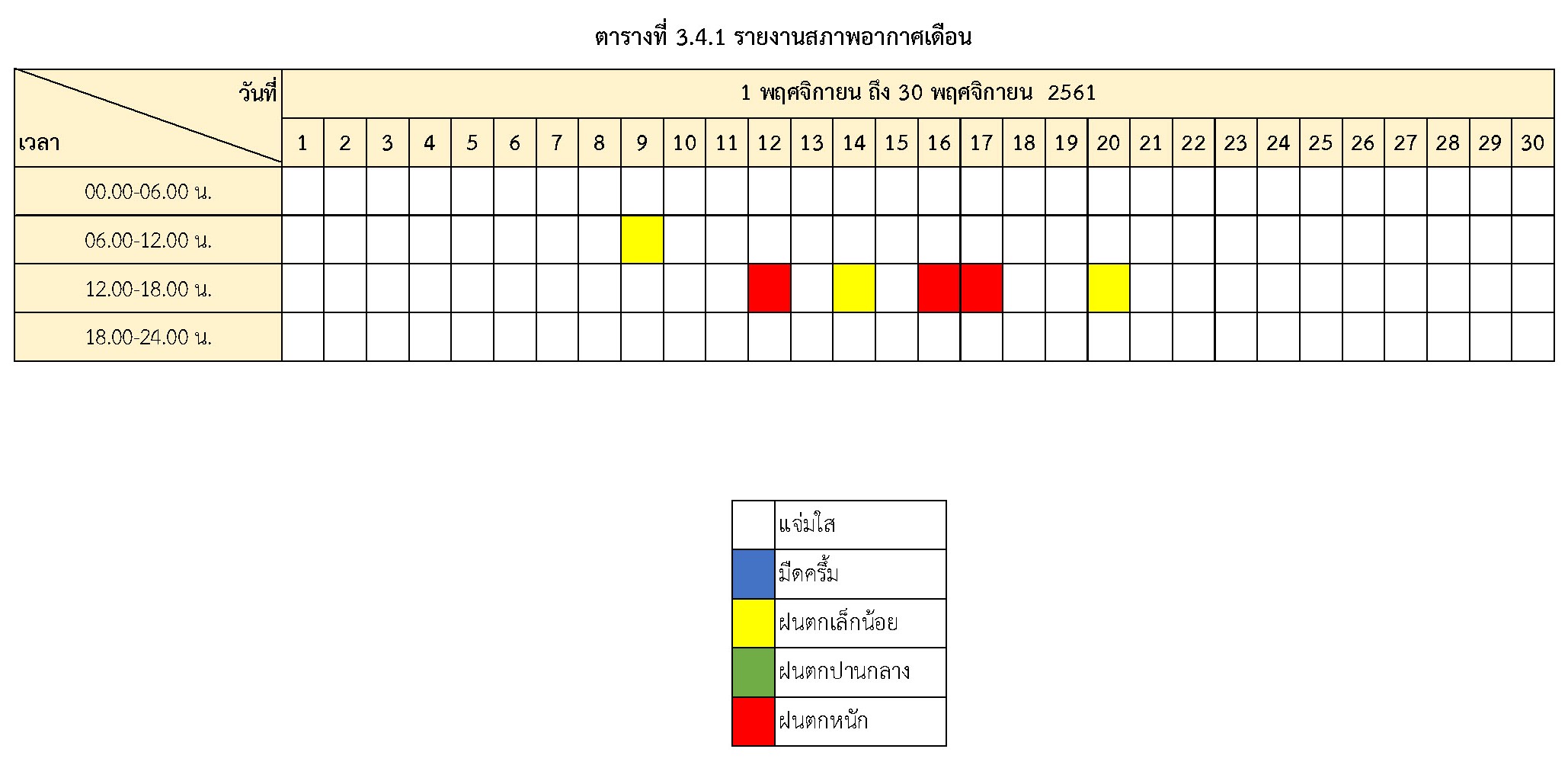 - ระหว่างวันที่ 1 พฤศจิกายน 2561 ถึงวันที่ 30 พฤศจิกายน 2561สภาพอากาศ สรุปตามตารางที่ 3.4.1