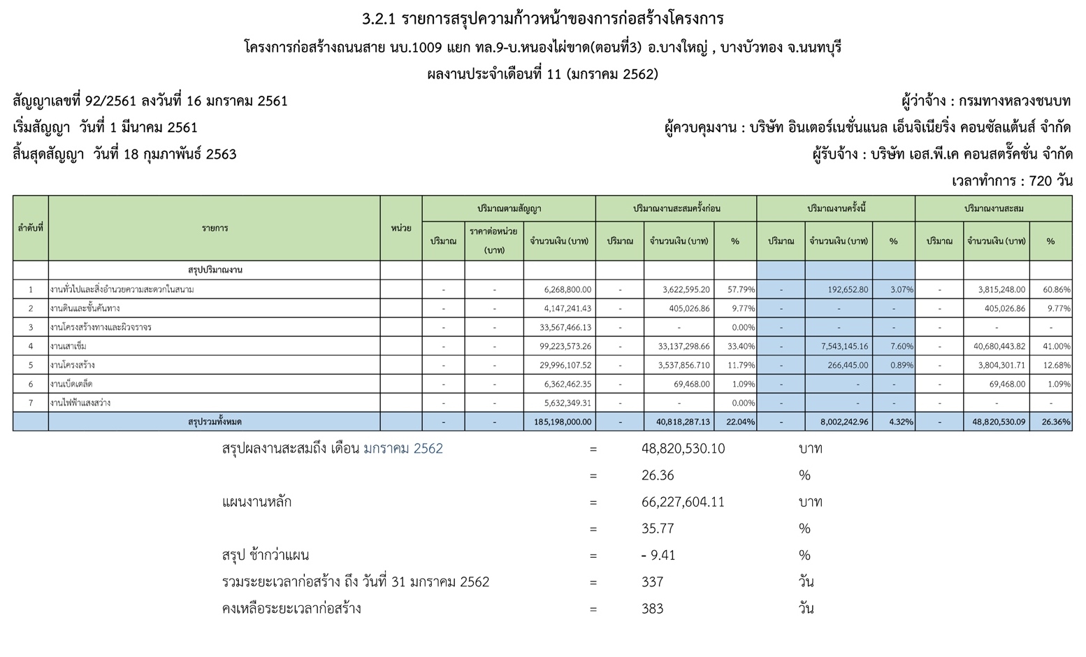 - คงเหลือระยะเวลาดำเนินการก่อสร้าง : 383 วัน