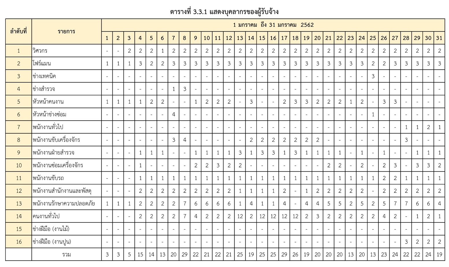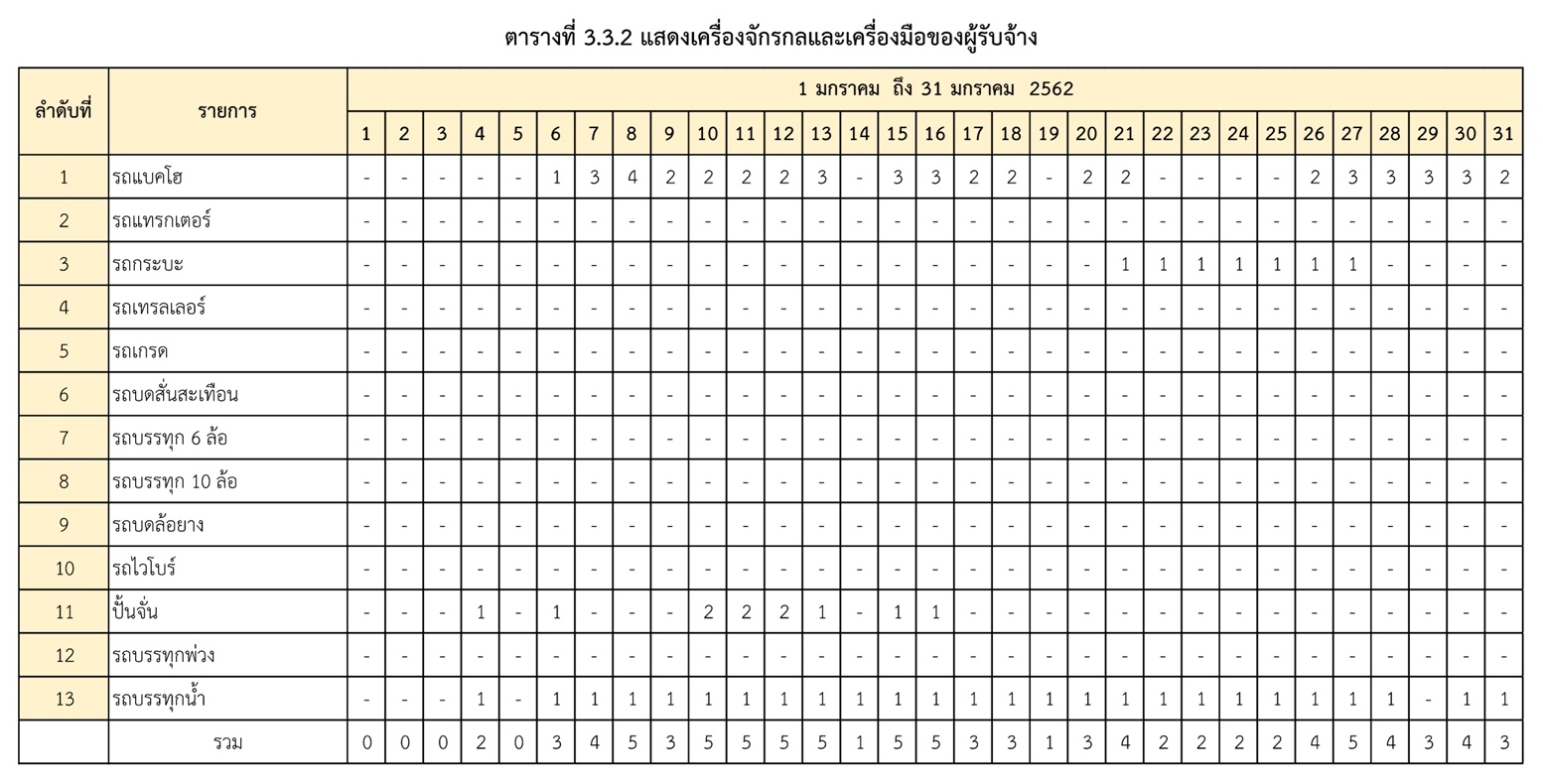 - ระหว่างวันที่ 1 มกราคม 2562 ถึงวันที่ 31 มกราคม 2562ผู้รับจ้างได้จัดเครื่องจักรอุปกรณ์ และบุคลากร เพื่อเข้าดำเนินการตามรายละเอียด ตารางที่ 3.3.1 และตารางที่ 3.3.2