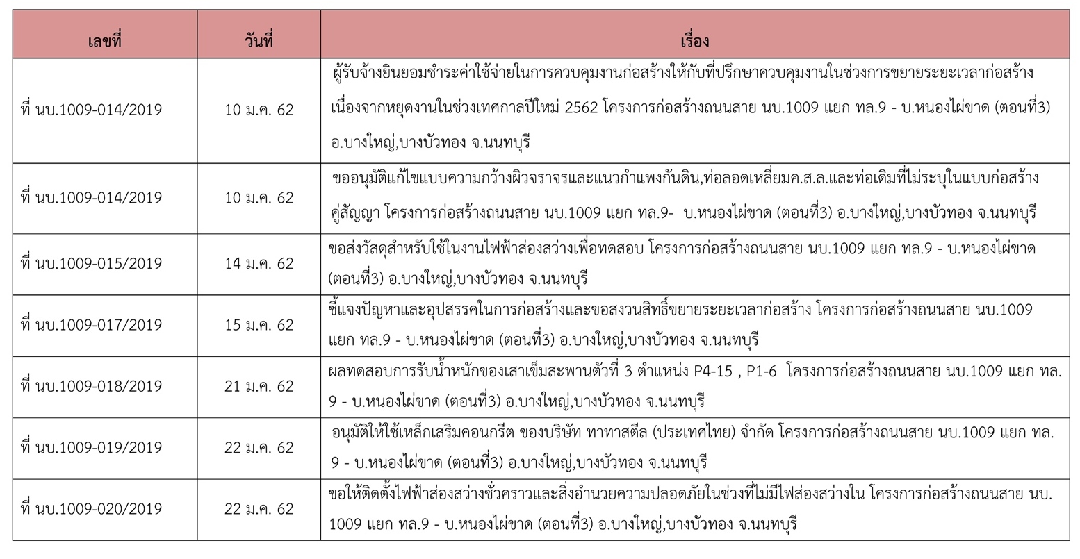 ที่ปรึกษาได้ปฏิบัติงานควบคุมการก่อสร้าง โครงการก่อสร้างก่อสร้างถนนสาย นบ.1009 แยก ทล.9-บ.หนองไผ่ขาด (ตอนที่3)อ.บางใหญ่ , บางบัวทอง จ.นนทบุรี ประจำเดือน มกราคม 2562 (ตั้งแต่วันที่ 1 – 31 มกราคม 2562 )