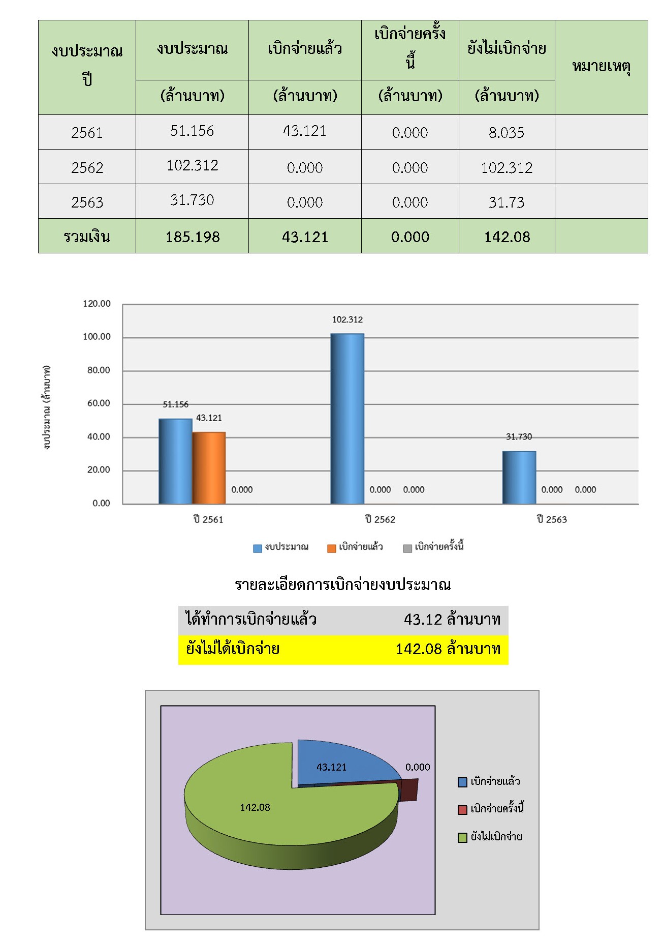 งบประมาณก่อสร้างทั้งหมด 185,198,000.-บาท ปีงบประมาณ 2561 เป็นเงิน 51,156,000.-บาท ปีงบประมาณ 2562 เป็นเงิน 102,312,000.-บาท ปีงบประมาณ 2563 เป็นเงิน31,730,000.-บาท
