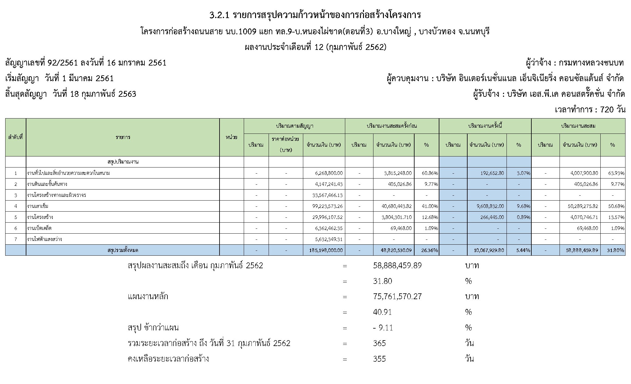 - คงเหลือระยะเวลาดำเนินการก่อสร้าง : 355 วัน
