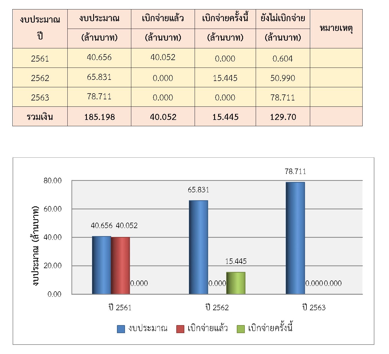งบประมาณก่อสร้างทั้งหมด 185,198,000.-บาท ปีงบประมาณ 2561 เป็นเงิน 40,656,000 บาท ปีงบประมาณ 2562 เป็นเงิน 65,831,000 บาท ปีงบประมาณ 2563 เป็นเงิน 78,711,000 บาท