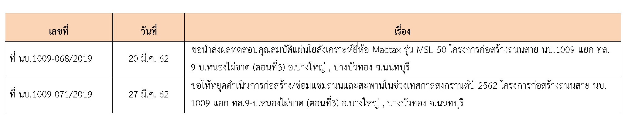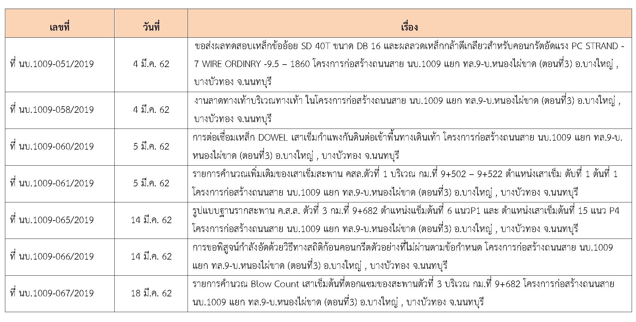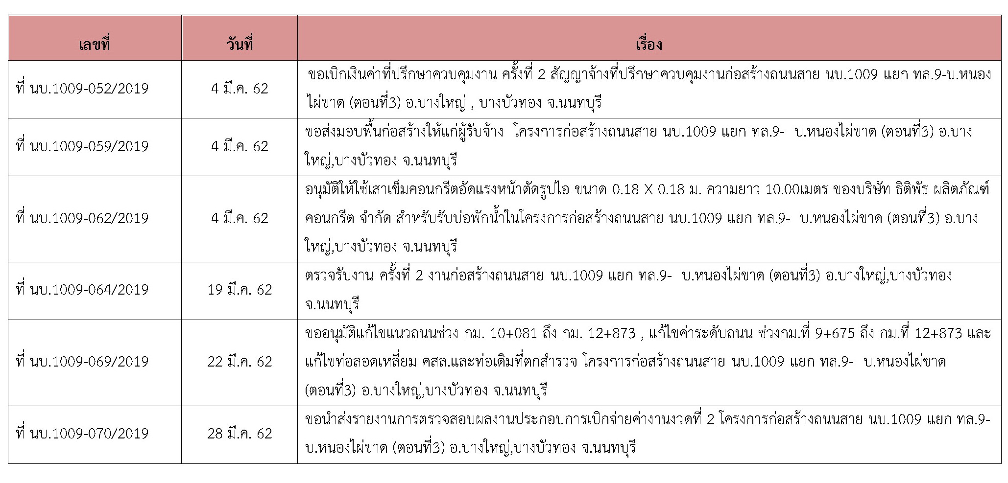 ที่ปรึกษาได้ปฏิบัติงานควบคุมการก่อสร้าง โครงการก่อสร้างก่อสร้างถนนสาย นบ.1009 แยก ทล.9-บ.หนองไผ่ขาด (ตอนที่3)อ.บางใหญ่ , บางบัวทอง จ.นนทบุรี ประจำเดือน มีนาคม 2562 (ตั้งแต่วันที่ 1 – 31 มีนาคม 2562 )
