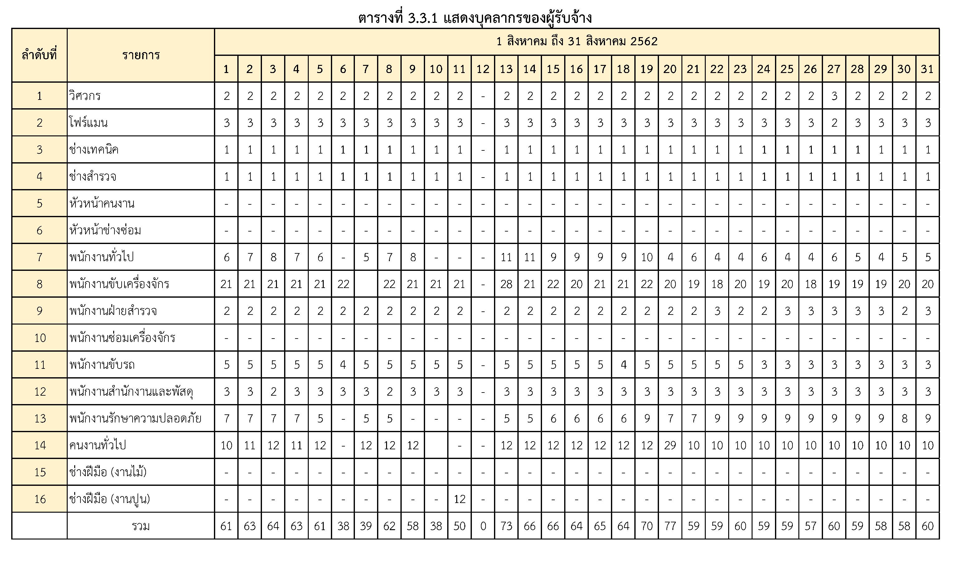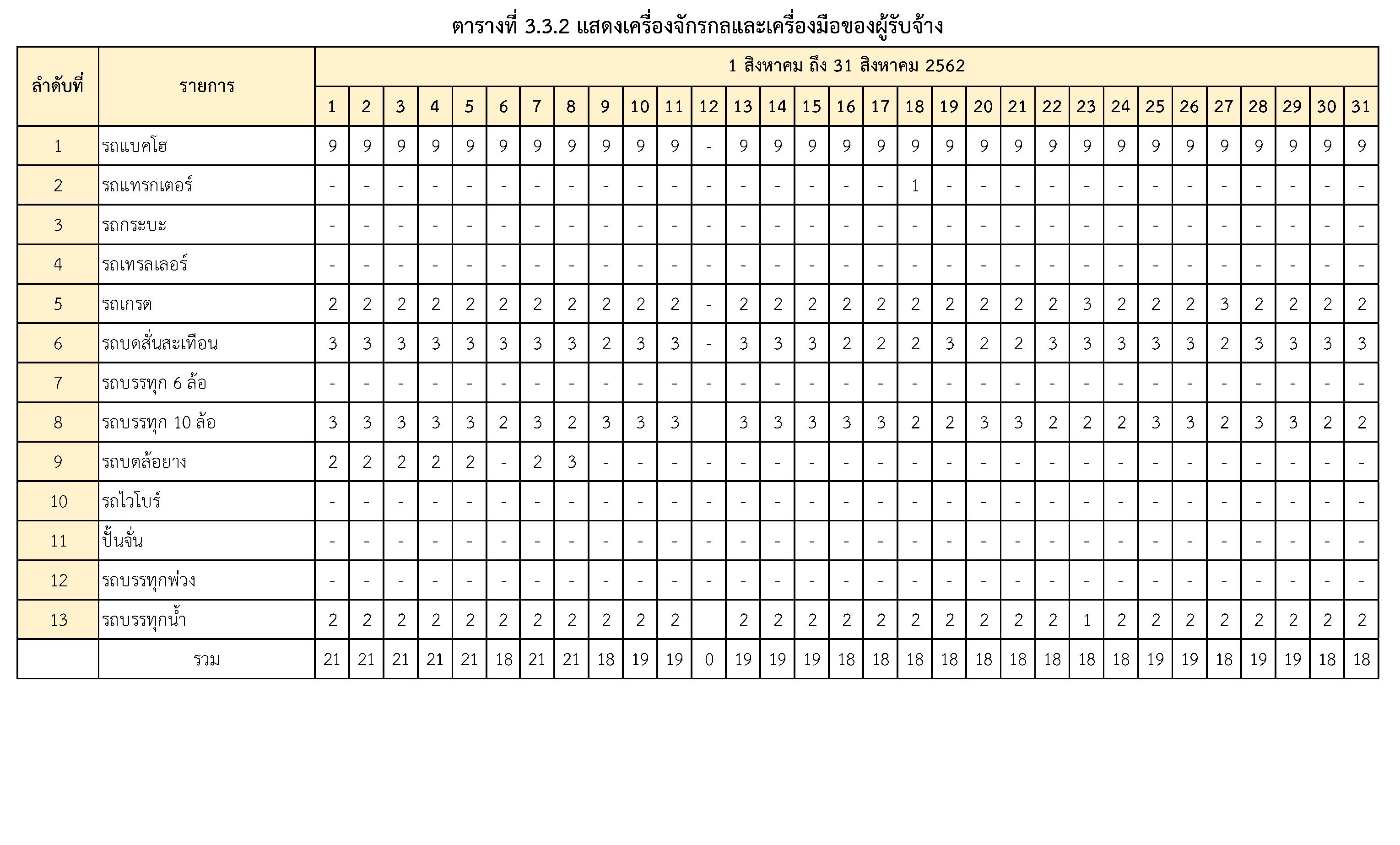 - ระหว่างวันที่ 1 สิงหาคม2562ถึงวันที่ 31สิงหาคม2562ผู้รับจ้างได้จัดเครื่องจักรอุปกรณ์ และบุคลากร เพื่อเข้าดำเนินการตามรายละเอียด ตารางที่ 3.3.1 และตารางที่ 3.3.2