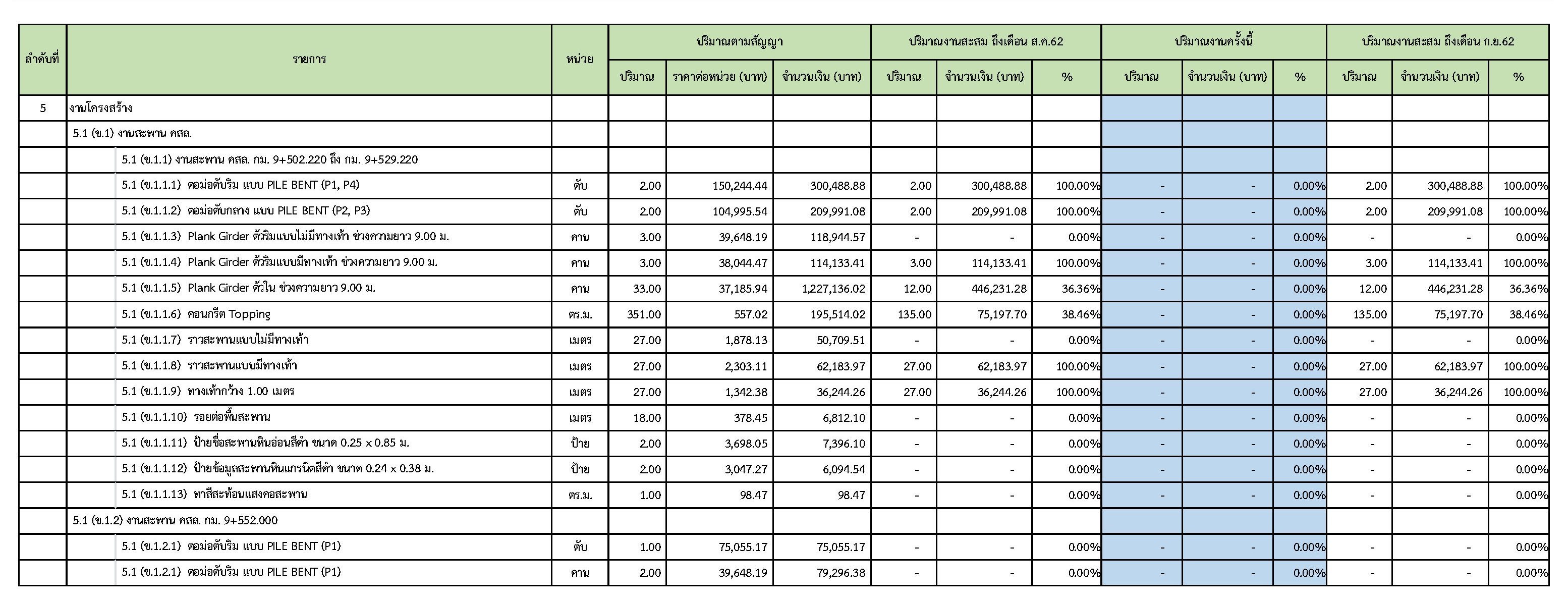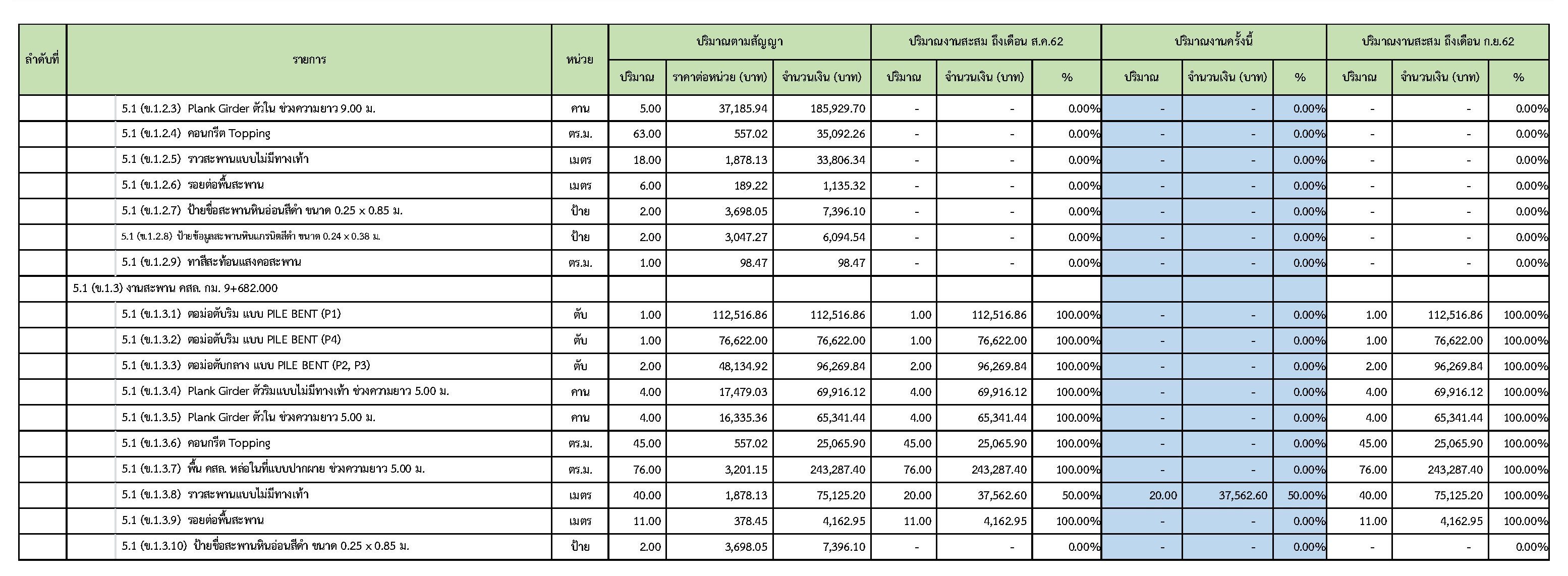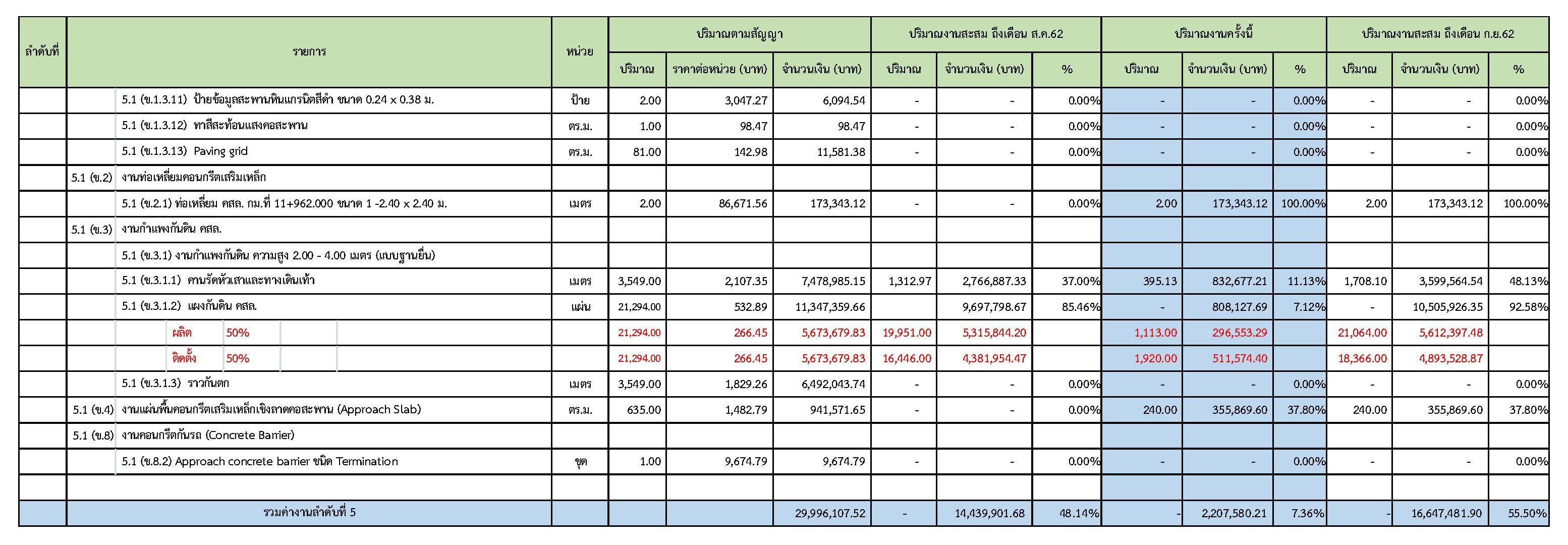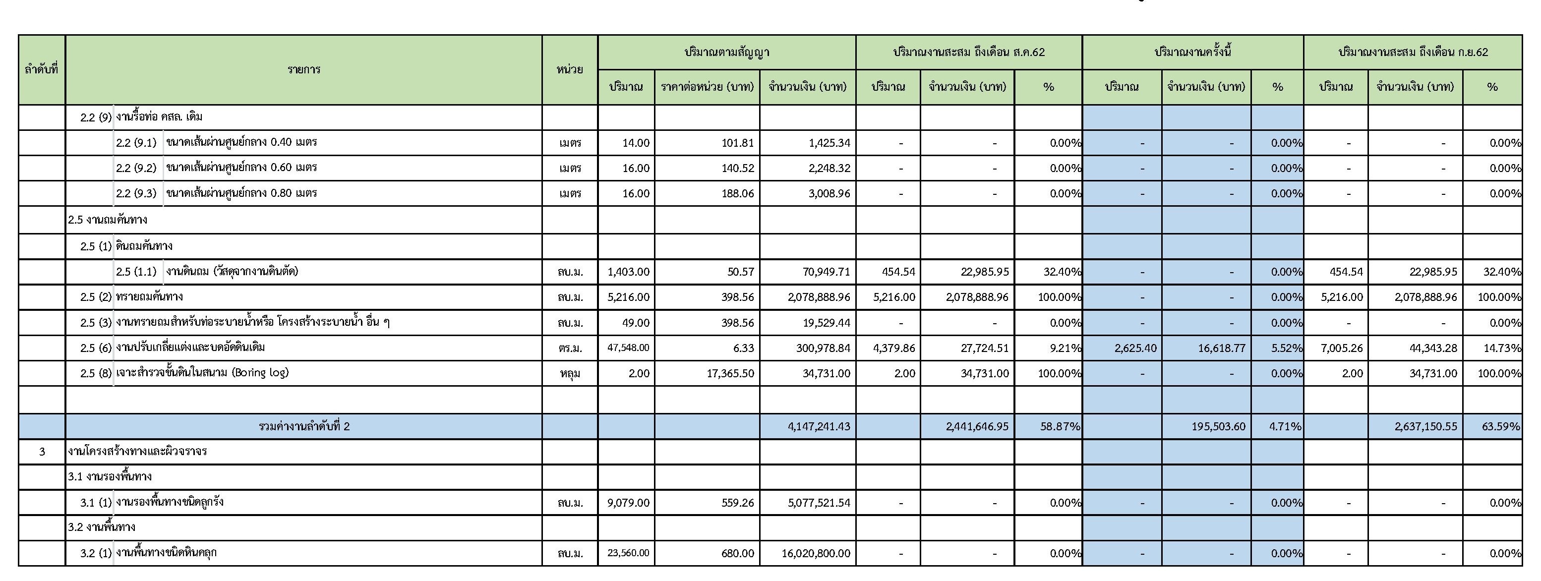 การปฏิบัติงานของผู้รับจ้างในเดือนกันยายน2562เป็นการดำเนินการในส่วนของงานทั่วไปและสิ่งอำนวยความสะดวกในสนาม, งานดินและชั้นคันทาง , งานโครงสร้าง และงานเบ็ดเตล็ด ทั้งนี้ทางโครงการฯ ได้เร่งรัดให้ผู้รับจ้างเร่งปฏิบัติงานให้แล้วเสร็จตามแผนงานที่วางไว้