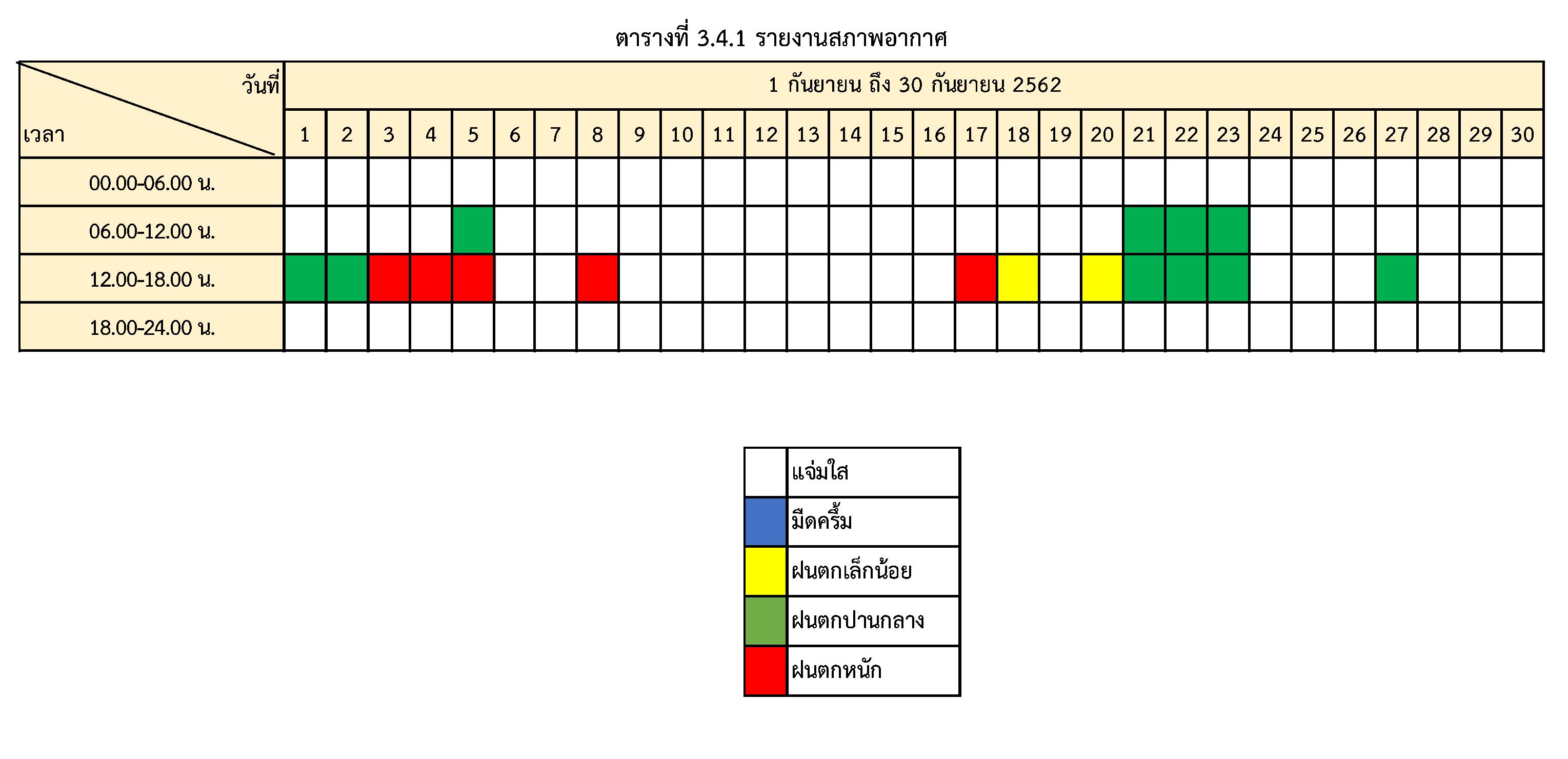 - ระหว่างวันที่ 1 กันยายน 2562 ถึงวันที่ 30 กันยายน 2562สภาพอากาศ สรุปตามตารางที่ 3.4.1