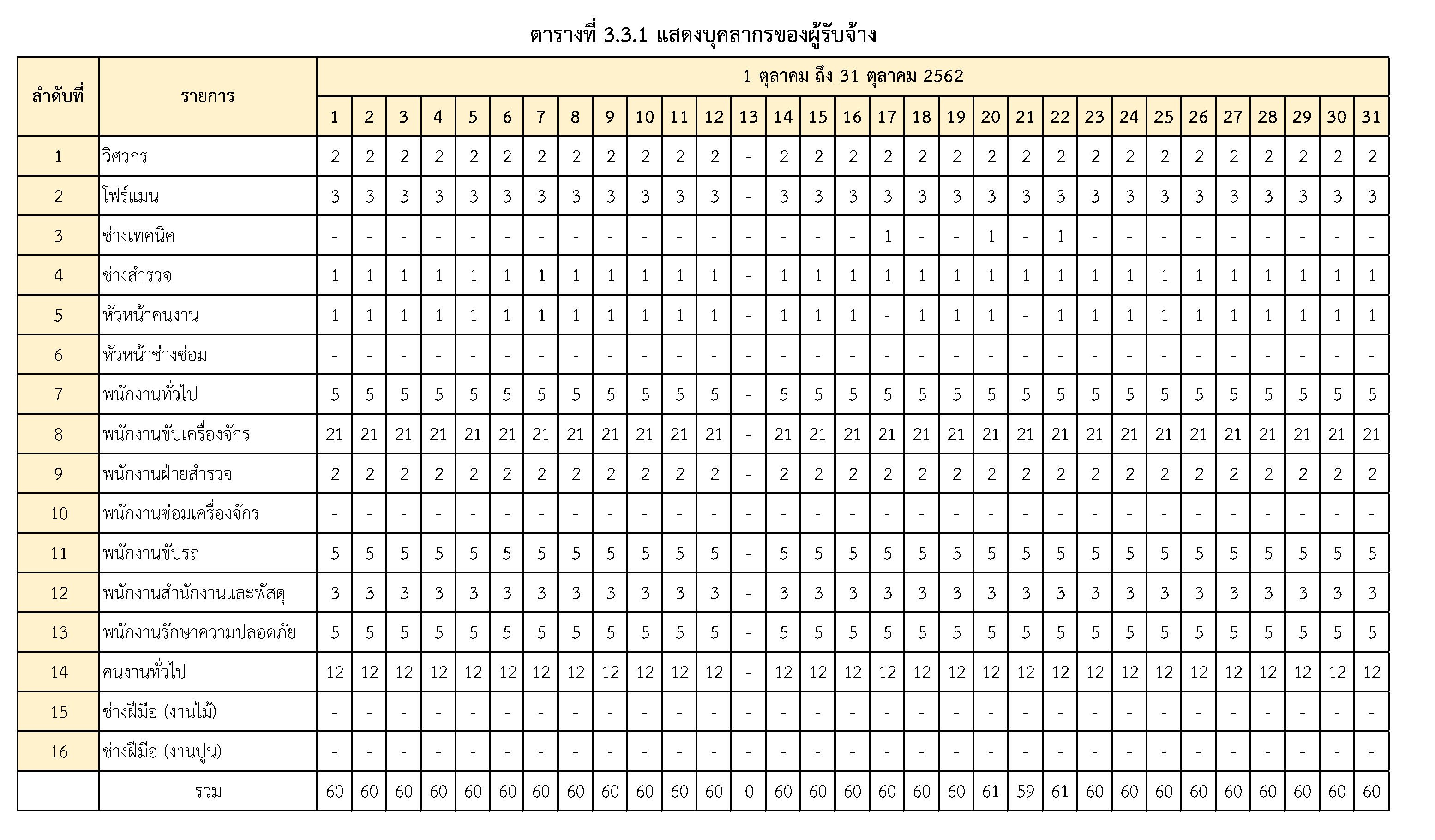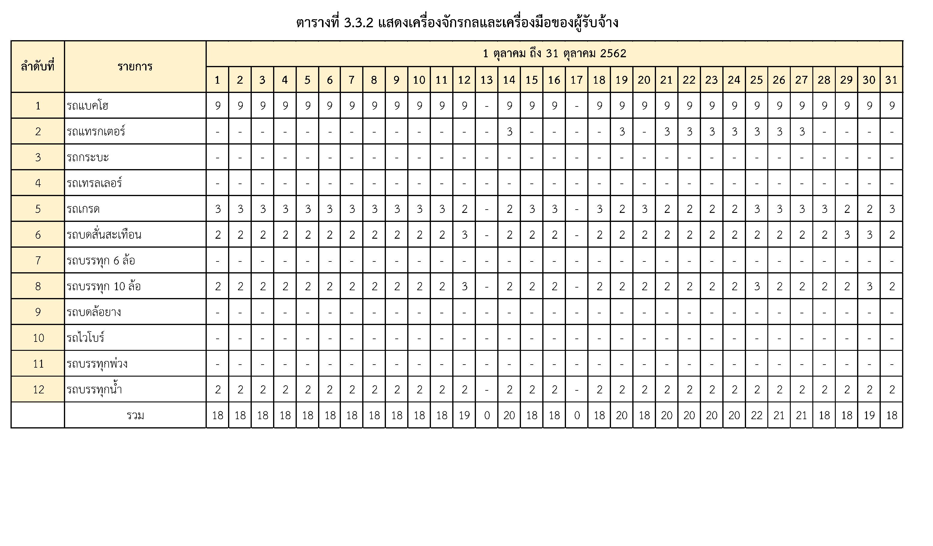 - ระหว่างวันที่ 1 ตุลาคม2562ถึงวันที่ 31ตุลาคม2562ผู้รับจ้างได้จัดเครื่องจักรอุปกรณ์ และบุคลากร เพื่อเข้าดำเนินการตามรายละเอียด ตารางที่ 3.3.1 และตารางที่ 3.3.2