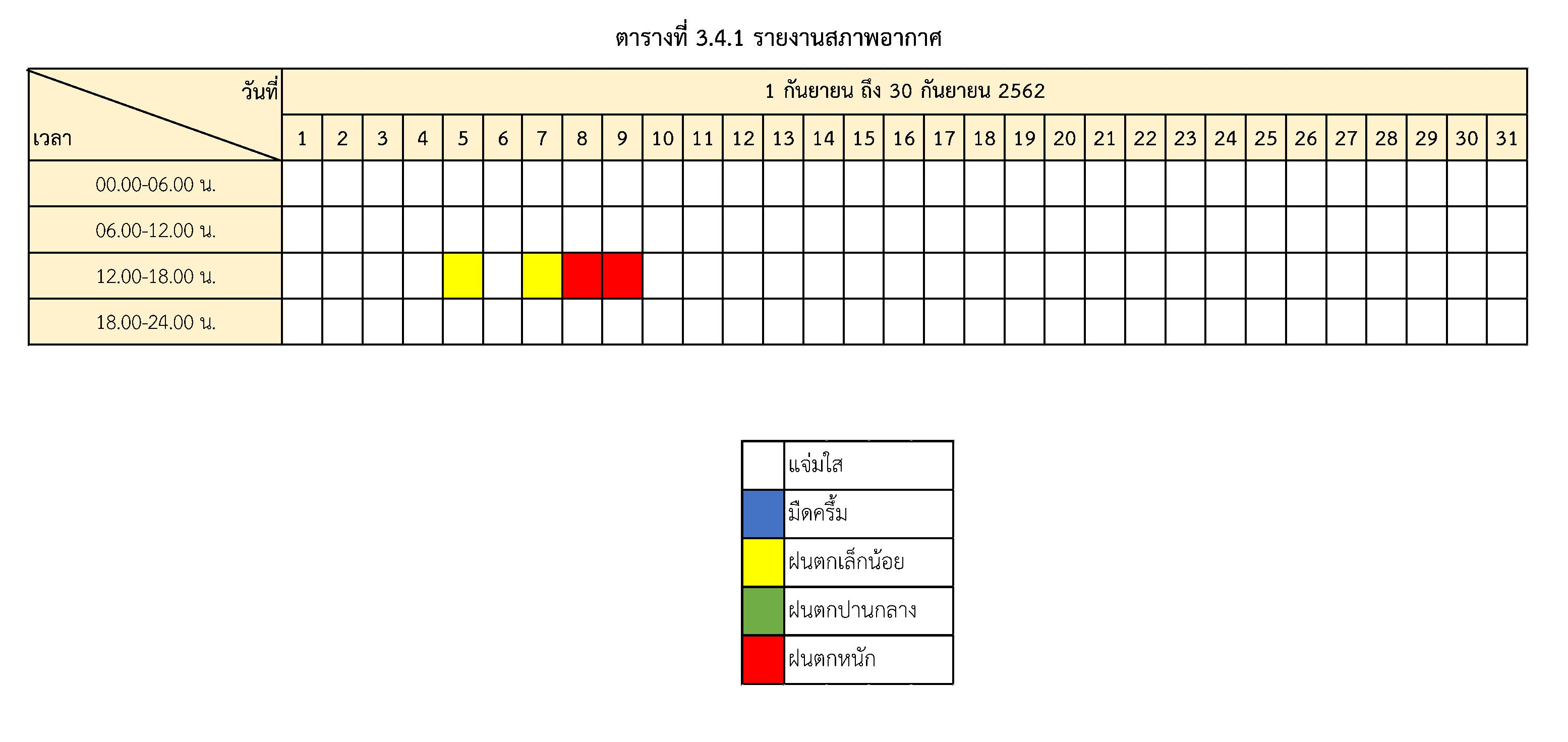 - ระหว่างวันที่ 1 ตุลาคม 2562 ถึงวันที่ 31 ตุลาคม 2562สภาพอากาศ สรุปตามตารางที่ 3.4.1