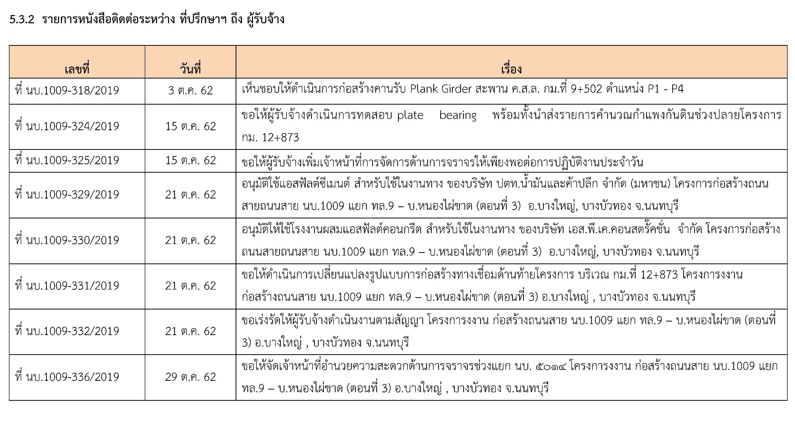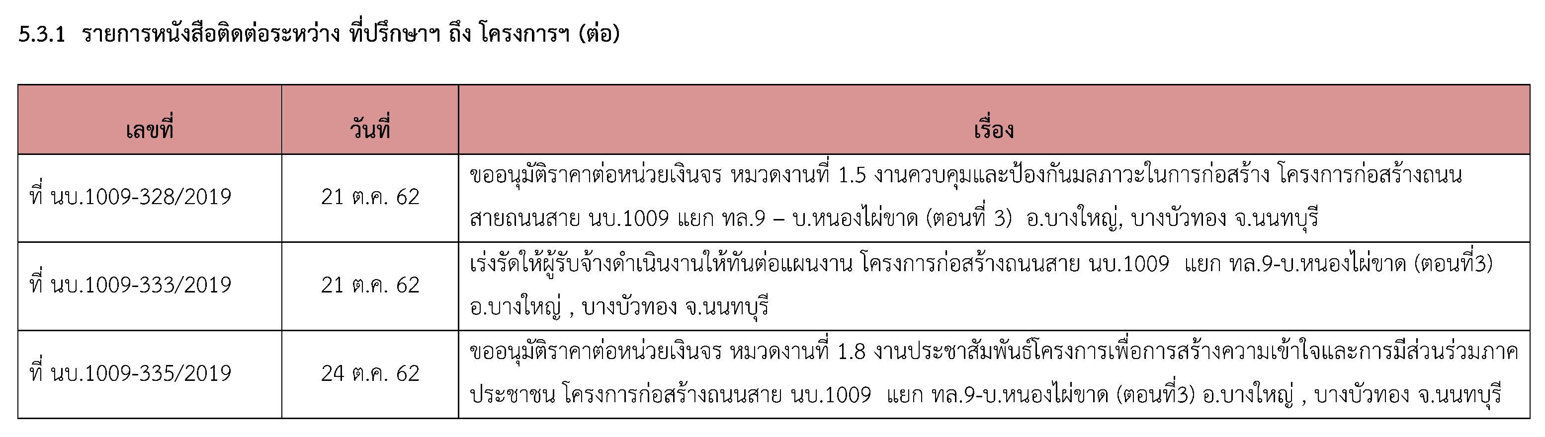 ที่ปรึกษาได้ปฏิบัติงานควบคุมการก่อสร้าง โครงการก่อสร้างก่อสร้างถนนสาย นบ.1009 แยก ทล.9-บ.หนองไผ่ขาด(ตอนที่3)อ.บางใหญ่ , บางบัวทอง จ.นนทบุรีประจำเดือน ตุลาคม2562