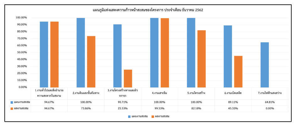 การปฏิบัติงานของผู้รับจ้างในเดือนธันวาคม2562เป็นการดำเนินการในส่วนของงานทั่วไปและสิ่งอำนวยความสะดวกในสนาม, งานโครงสร้างทางและผิวจราจร, งานโครงสร้าง และงานเบ็ดเตล็ด ทั้งนี้ทางโครงการฯ ได้เร่งรัดให้ผู้รับจ้างเร่งปฏิบัติงานให้แล้วเสร็จตามแผนงานที่วางไว้