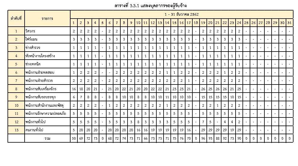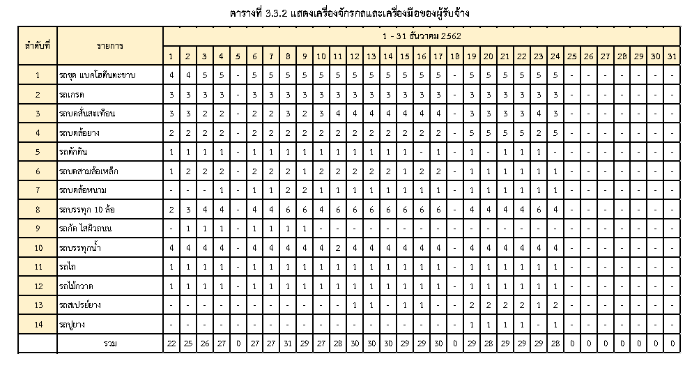 - ระหว่างวันที่ 1 ธันวาคม2562ถึงวันที่ 31 ธันวาคม 2562 ผู้รับจ้างได้จัดเครื่องจักรอุปกรณ์ และบุคลากร เพื่อเข้าดำเนินการตามรายละเอียด ตารางที่ 3.3.1 และตารางที่ 3.3.2