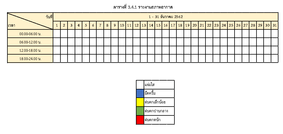 - ระหว่างวันที่1 ธันวาคม 2562 ถึงวันที่ 31 ธันวาคม 2562สภาพอากาศ สรุปตามตารางที่ 3.4.1