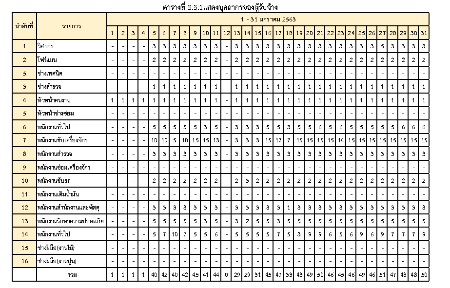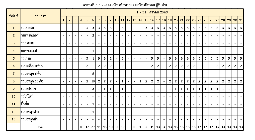 - ระหว่างวันที่ 1 มกราคม2563ถึงวันที่ 31 มกราคม 2563ผู้รับจ้างได้จัดเครื่องจักรอุปกรณ์ และบุคลากร เพื่อเข้าดำเนินการตามรายละเอียด ตารางที่ 3.3.1 และตารางที่ 3.3.2
