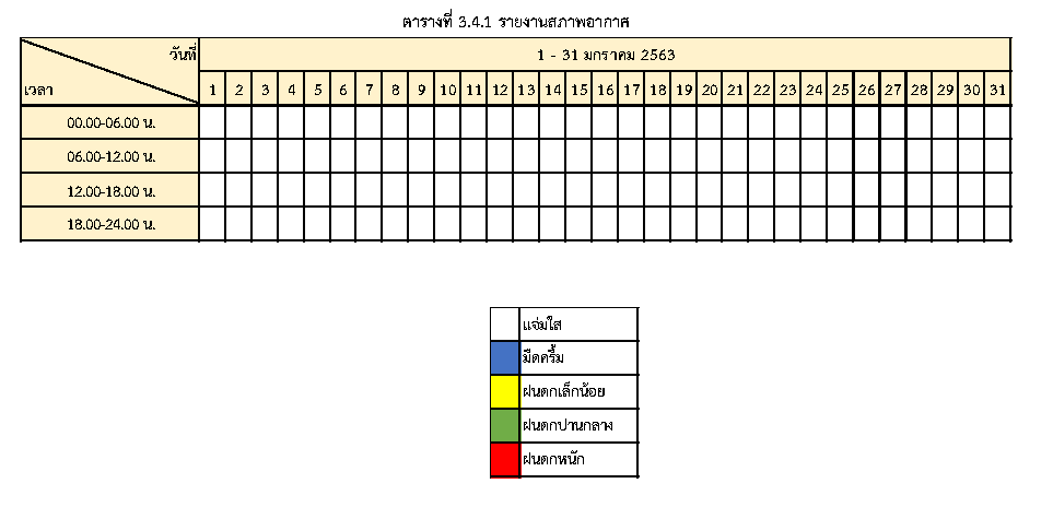 - ระหว่างวันที่1มกราคม 2563 ถึงวันที่ 31 มกราคม 2563สภาพอากาศ สรุปตามตารางที่ 3.4.1