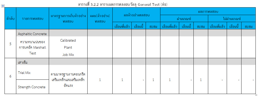 ในระหว่างวันที่ 1-31 ตุลาคม ๒๕๕๙ ผู้ว่าจ้างได้เสนอหนังสือขออนุมัติใช้วัสดุถึงที่ปรึกษา โดยที่ปรึกษาได้ตรวจสอบวัสดุดังกล่าวมีผลทดสอบดังตาราง