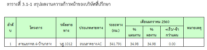 ที่ปรึกษาได้ดำเนินการควบคุมงานก่อสร้าง ในเดือน มกราคม 2560 มีรายละเอียดการดำเนินงานและความก้าวหน้าของงานตามที่กล่าวในบทที่ 2 ข้อ2.4 รายละเอียดความก้าวหน้าของงานในสายทาง