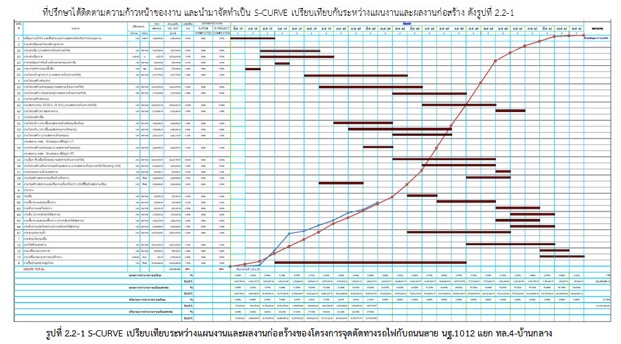 ที่ปรึกษาได้ติดตามความก้าวหน้าของงาน และนำมาจัดทำเป็น S-CURVE เปรียบเทียบกันระหว่างแผนงานและผลงานก่อสร้าง ดังรูปที่ 2.2-1