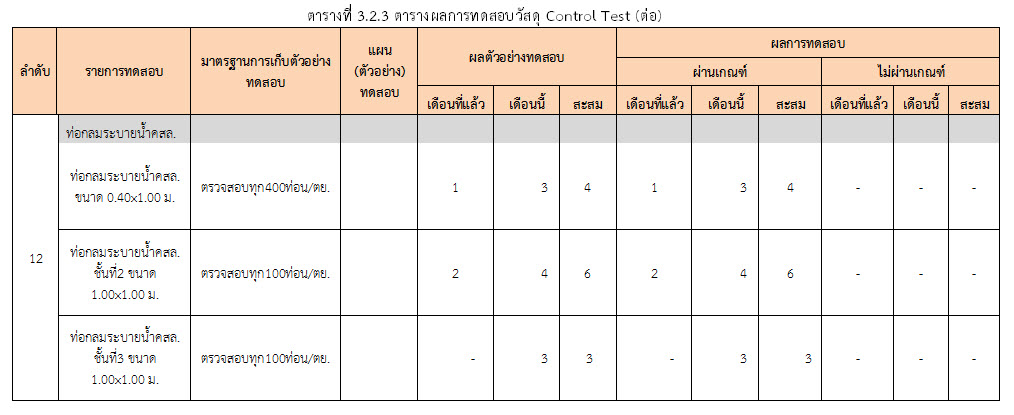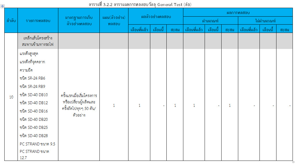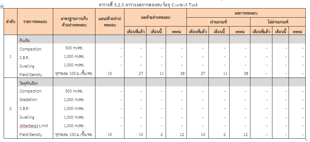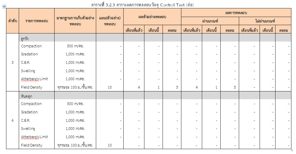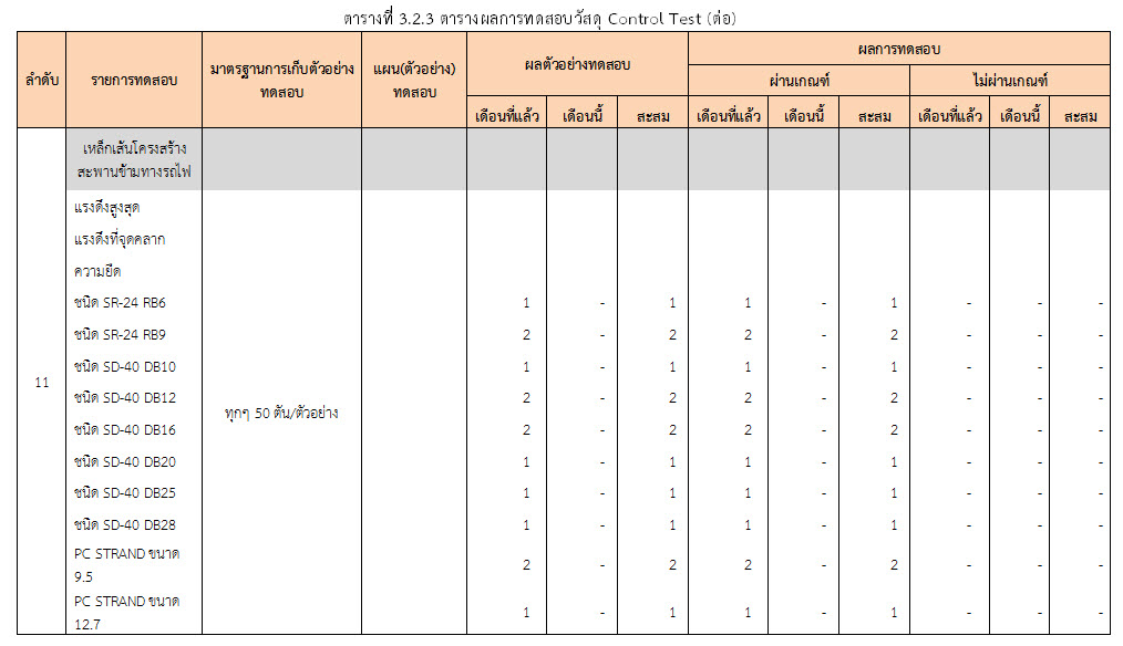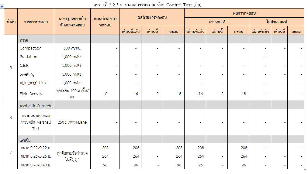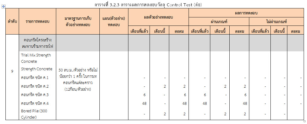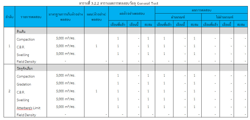 ในระหว่างวันที่ 1-31 มีนาคม 2560 ผู้ว่าจ้างได้เสนอหนังสือขออนุมัติใช้วัสดุถึงที่ปรึกษา โดยที่ปรึกษาได้ตรวจสอบวัสดุดังกล่าวมีผลทดสอบดังตาราง