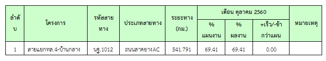 ที่ปรึกษาได้ดำเนินการควบคุมงานก่อสร้าง ในเดือน ตุลาคม 2560 มีรายละเอียดการดำเนินงานและความก้าวหน้าของงานตามที่กล่าวในบทที่ 2 ข้อ2.4 รายละเอียดความก้าวหน้าของงานในสายทาง