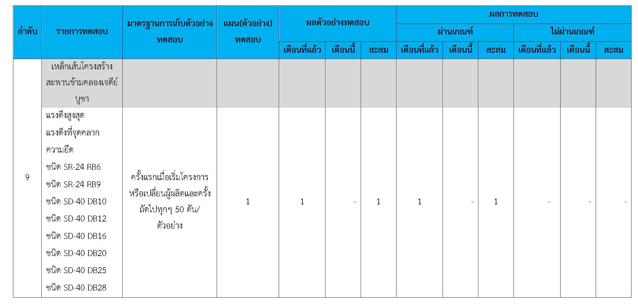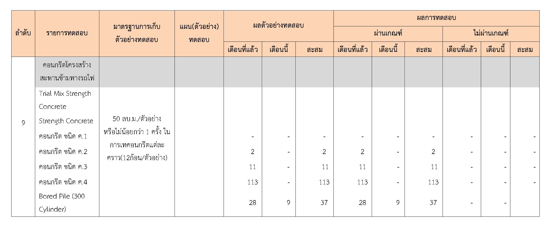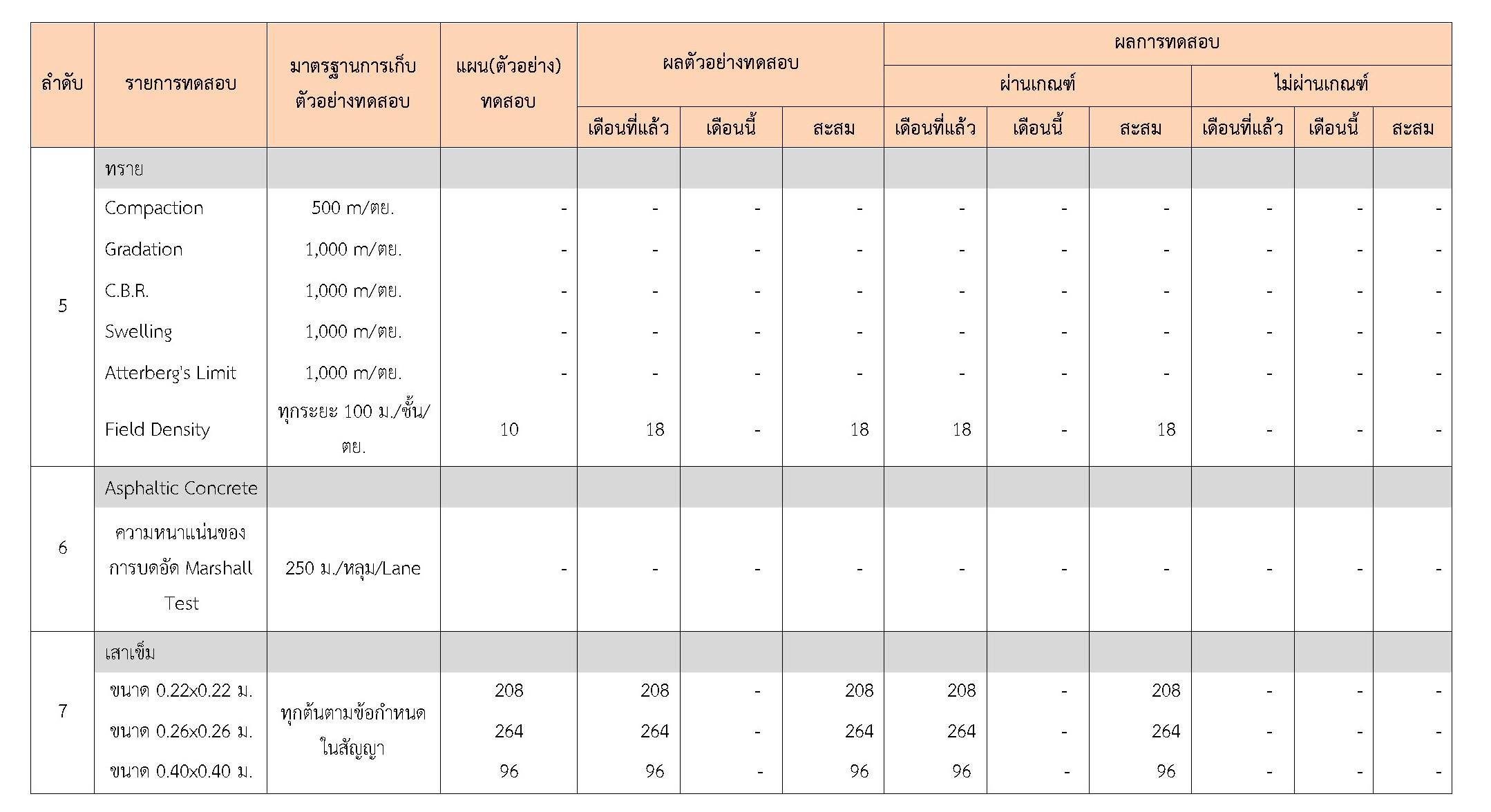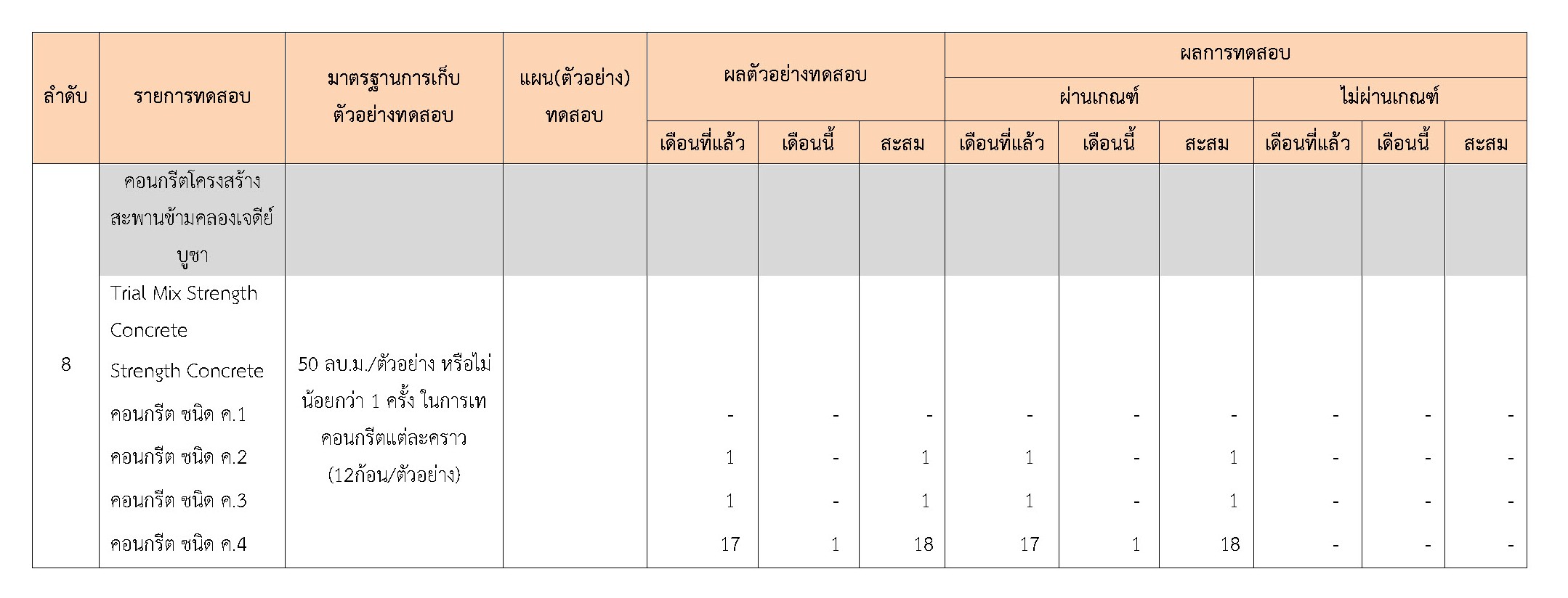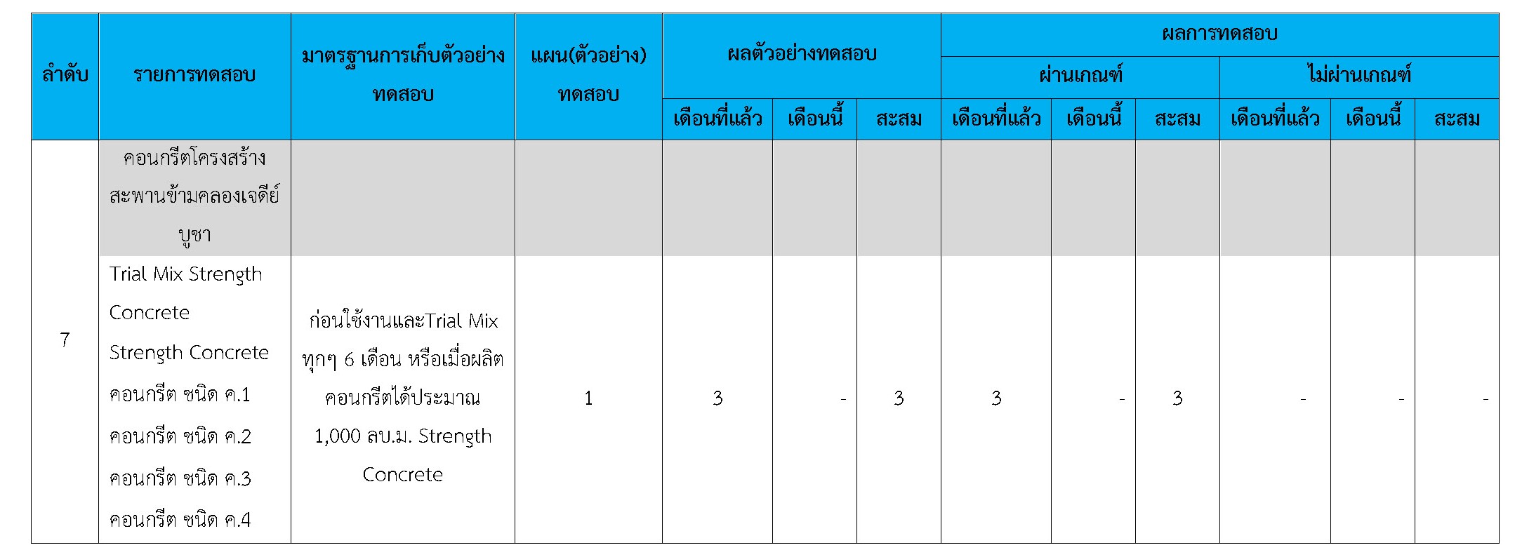 ในระหว่างวันที่ 1-31 ธันวาคม 2560 ผู้ว่าจ้างได้เสนอหนังสือขออนุมัติใช้วัสดุถึงที่ปรึกษา โดยที่ปรึกษาได้ตรวจสอบวัสดุดังกล่าวมีผลทดสอบดังตาราง