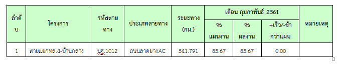 ที่ปรึกษาได้ดำเนินการควบคุมงานก่อสร้าง ในเดือน กุมภาพันธ์ 2561 มีรายละเอียดการดำเนินงานและความก้าวหน้าของงานตามที่กล่าวในบทที่ 2 ข้อ2.4 รายละเอียดความก้าวหน้าของงานในสายทาง