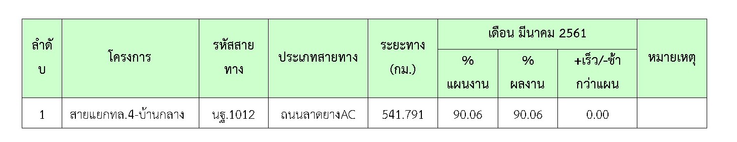 ที่ปรึกษาได้ดำเนินการควบคุมงานก่อสร้าง ในเดือน มีนาคม 2561 มีรายละเอียดการดำเนินงานและความก้าวหน้าของงานตามที่กล่าวในบทที่ 2 ข้อ2.4 รายละเอียดความก้าวหน้าของงานในสายทาง