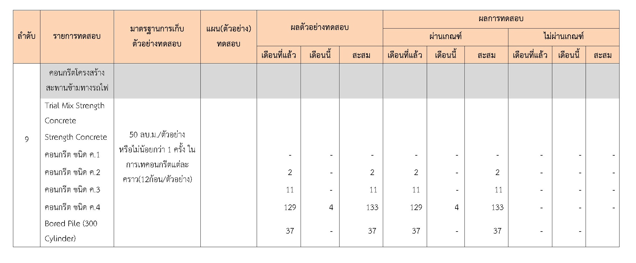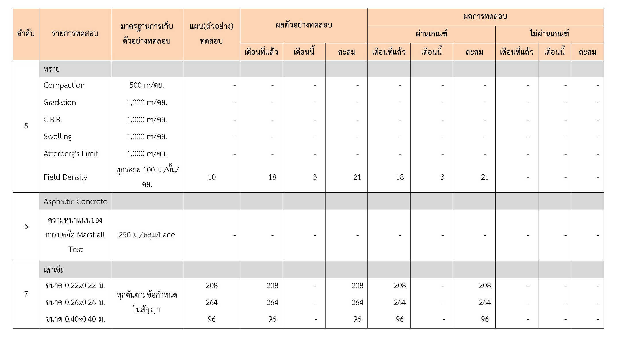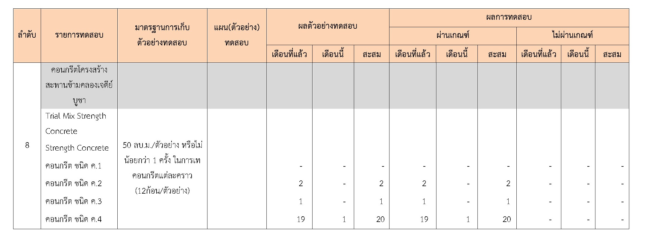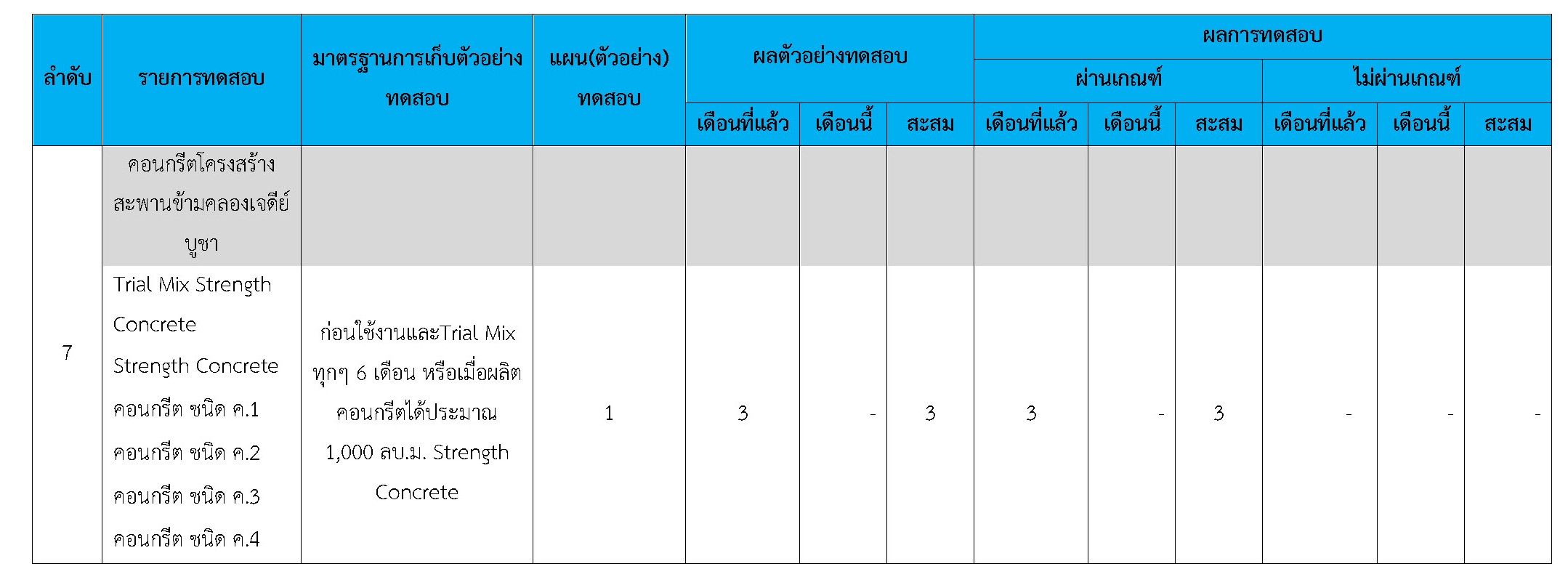 ในระหว่างวันที่ 1-31 มีนาคม 2561 ผู้ว่าจ้างได้เสนอหนังสือขออนุมัติใช้วัสดุถึงที่ปรึกษา โดยที่ปรึกษาได้ตรวจสอบวัสดุดังกล่าวมีผลทดสอบดังตาราง