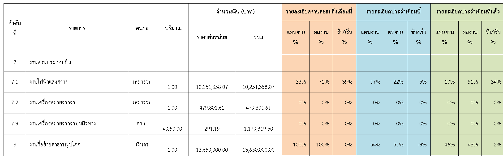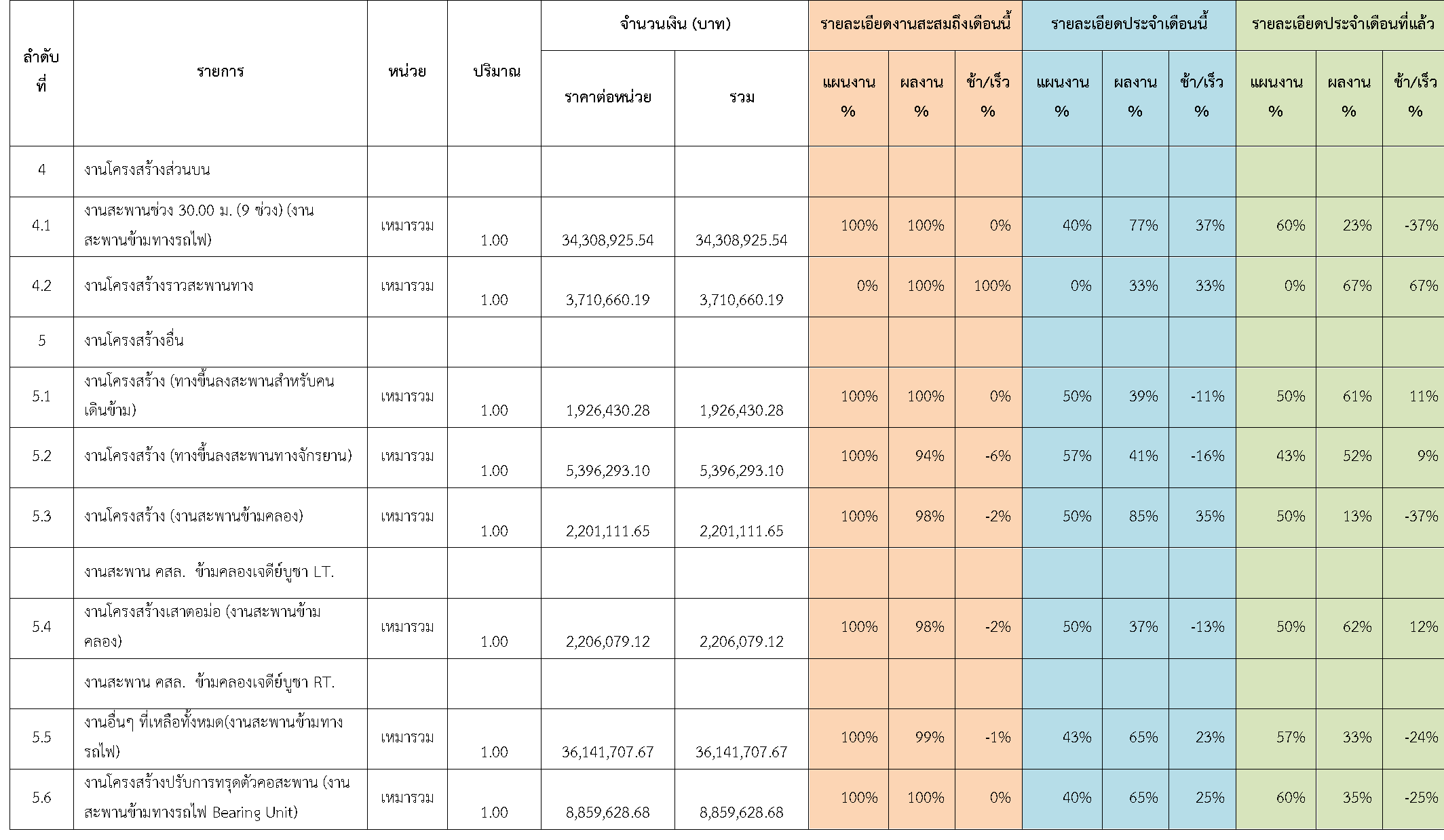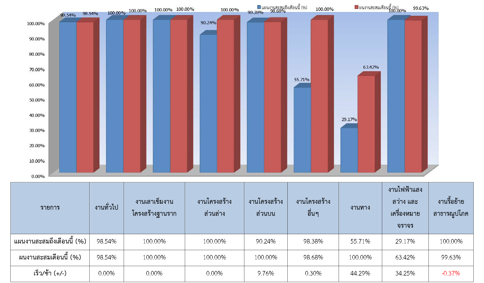 ความก้าวหน้าของเดือนพฤษภาคม 2561 ของการปฏิบัติงาน (99.903%) กำลังดำเนินการติดตั้งราวกันตกสะพานจักรยาน, ราวกันตกสะพานคนเดินข้าม, งานติดตั้งกำแพงกันเสียง, งานปูพื้นทางเดินเท้า, งานเทคอนกรีตคันหินรางตื้น, งานติดตั้งรางระบายน้ำฝน, งานติดตั้งไฟฟ้าแสงสว่าง และงานเทคอนกรีตพื้นถนนคอนกรีต ผลงานความก้าวหน้าแสดงไว้ใน ตารางที่ 2.1-1