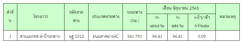ที่ปรึกษาได้ดำเนินการควบคุมงานก่อสร้าง ในเดือน มิถุนายน 2561 มีรายละเอียดการดำเนินงานและความก้าวหน้าของงานตามที่กล่าวในบทที่ 2 ข้อ2.4 รายละเอียดความก้าวหน้าของงานในสายทาง