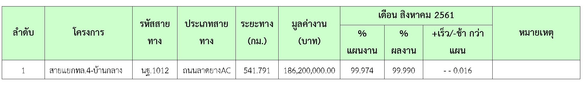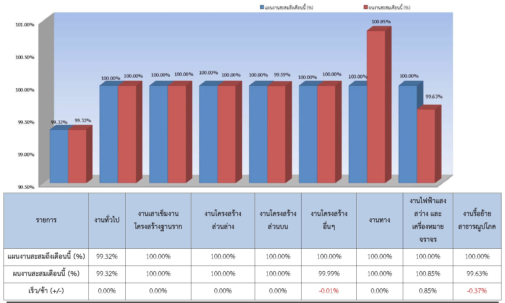 ความก้าวหน้าของเดือนสิงหาคม 2561 ของการปฏิบัติงาน (99.990%) กำลังดำเนินการตรวจสอบการทำ Anti Skid, ตรวจสอบความหนาของ Anti Skidและ ตรวจสอบงานรั้วกั้นใต้สะพานข้ามทางรถไฟ ผลงานความก้าวหน้าแสดงไว้ใน ตารางที่ 2.1-1
