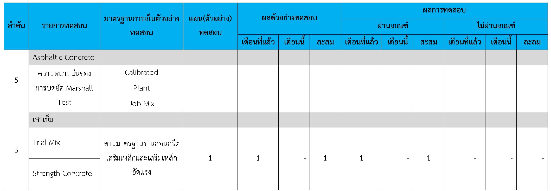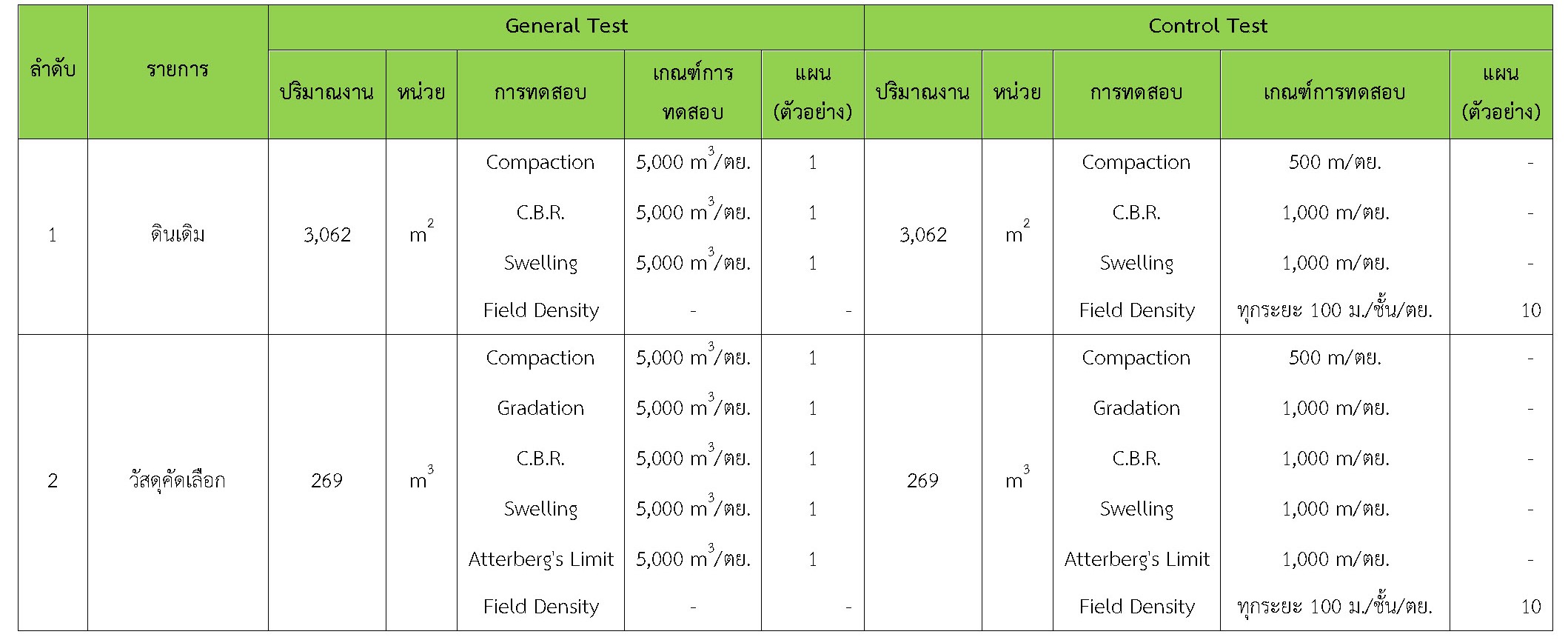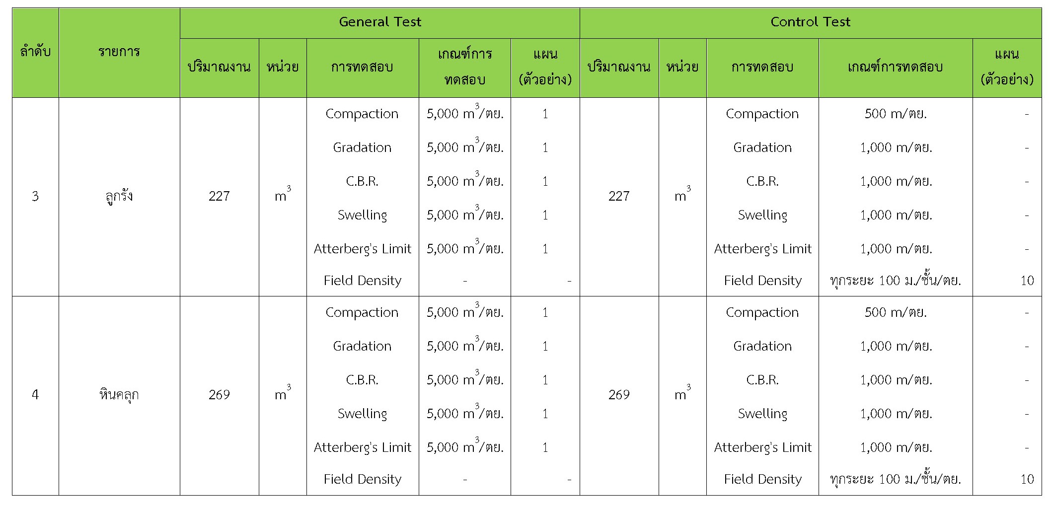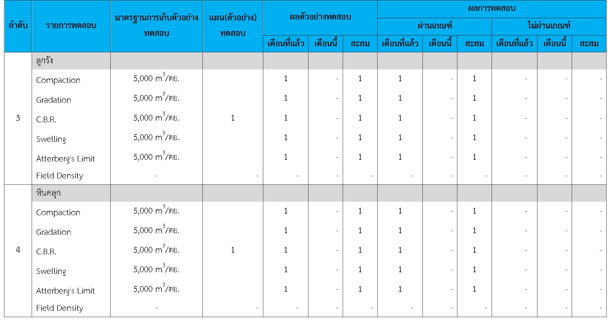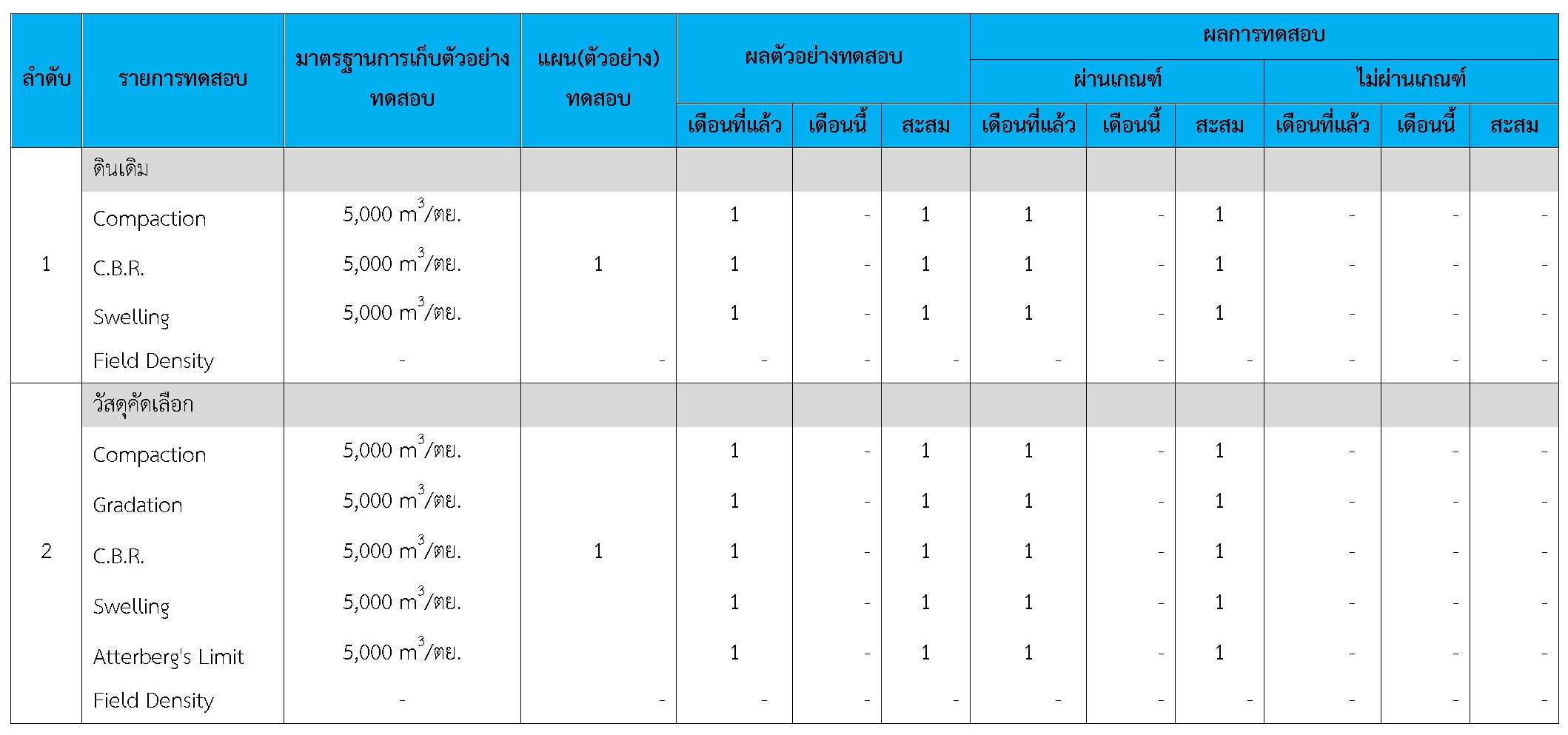 ในระหว่างวันที่ 1-30 กันยายน 2561 ผู้ว่าจ้างได้เสนอหนังสือขออนุมัติใช้วัสดุถึงที่ปรึกษา โดยที่ปรึกษาได้ตรวจสอบวัสดุดังกล่าวมีผลทดสอบดังตาราง
