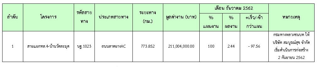 ในเดือน ธันวาคม 2562 มีความก้าวหน้าของงานก่อสร้าง แต่ไม่มีการตรวจรับงานใดๆ ดังสรุปในตารางที่ 2.3-1