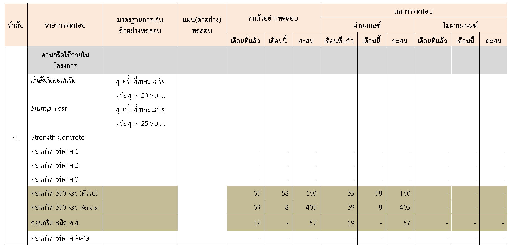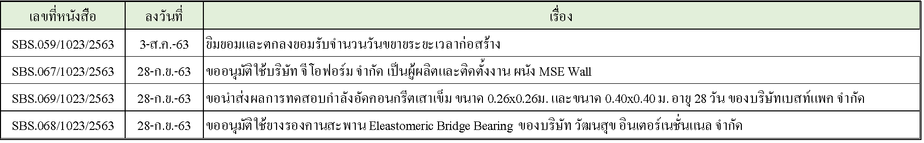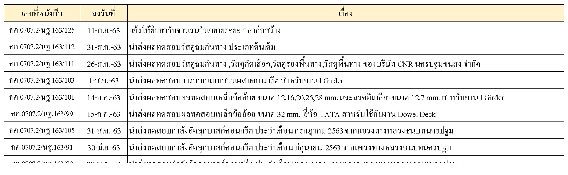 ในระหว่างวันที่ 1-30 กันยายน 2563ผู้ว่าจ้างได้เสนอหนังสือขออนุมัติใช้วัสดุถึงที่ปรึกษา โดยที่ปรึกษาได้ตรวจสอบวัสดุดังกล่าวมีผลทดสอบดังตาราง