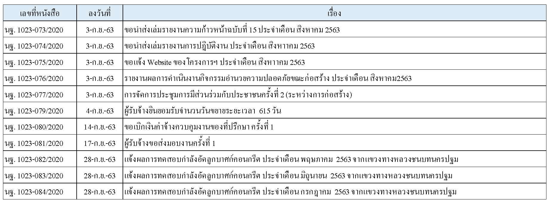 ในการดำเนินงานควบคุมงานก่อสร้าง ได้มีการจัดส่งเอกสารหนังสือต่างๆ ระหว่างกรมทางหลวงชนบท ที่ปรึกษา และผู้รับจ้างดังนี้