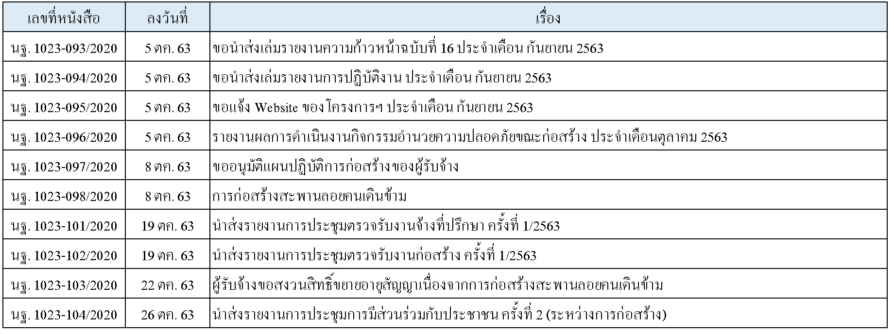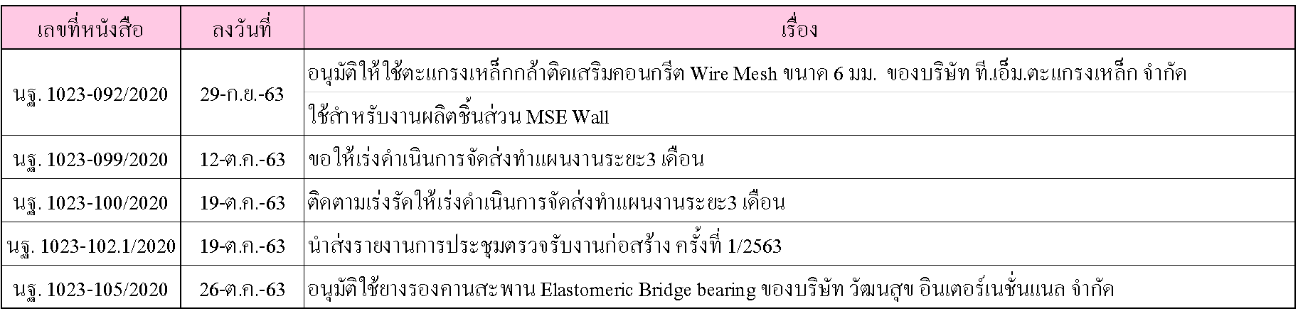 ในการดำเนินงานควบคุมงานก่อสร้าง ได้มีการจัดส่งเอกสารหนังสือต่างๆ ระหว่างกรมทางหลวงชนบท ที่ปรึกษา และผู้รับจ้างดังนี้