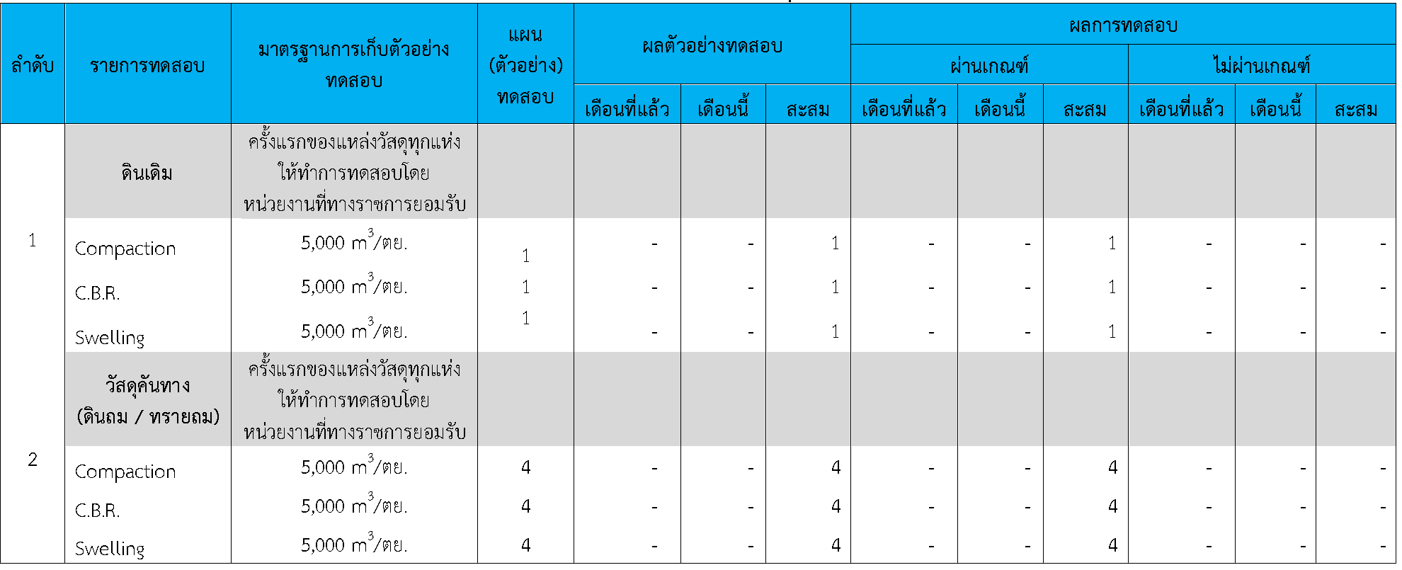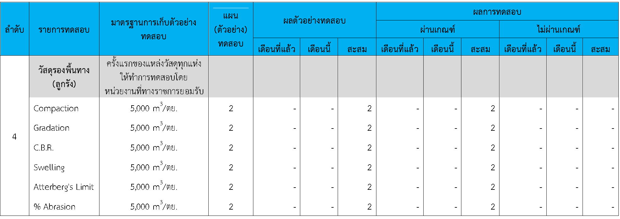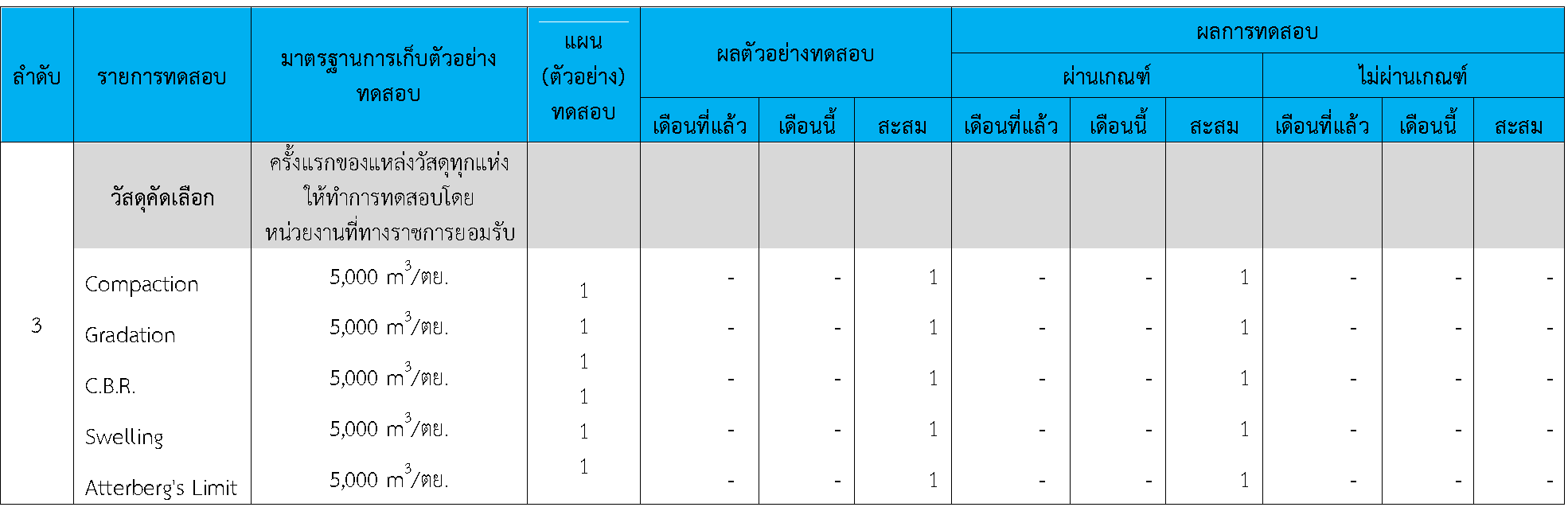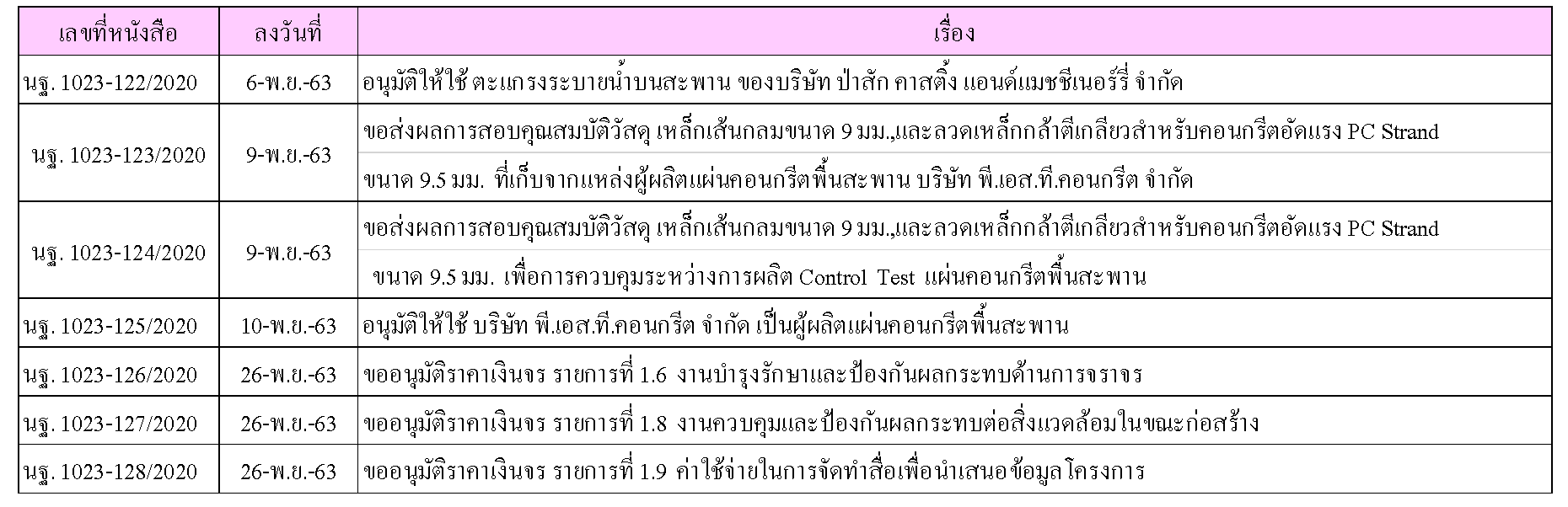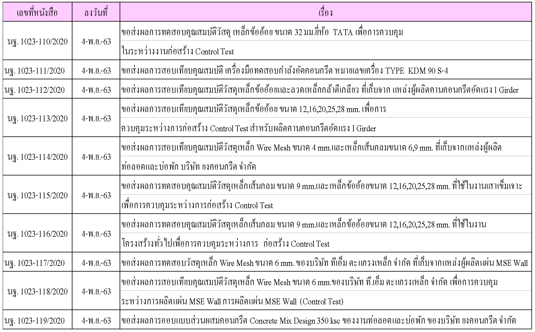 ในระหว่างวันที่ 1-30พฤศจิกายน 2563 ผู้ว่าจ้างได้เสนอหนังสือขออนุมัติใช้วัสดุถึงที่ปรึกษา โดยที่ปรึกษาได้ตรวจสอบวัสดุดังกล่าวมีผลทดสอบดังตาราง