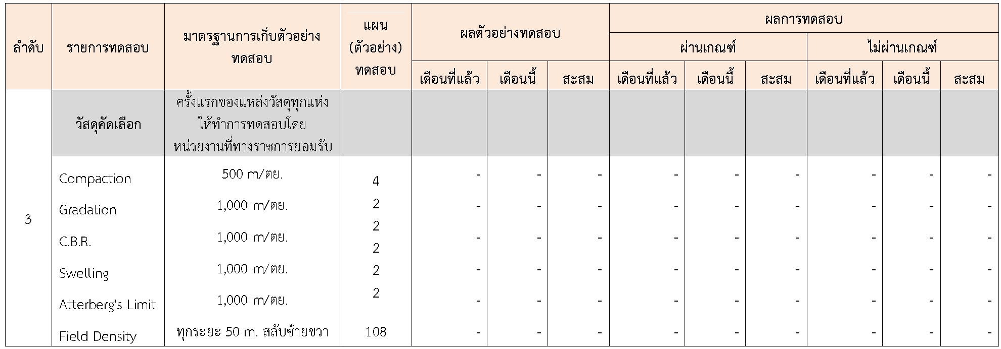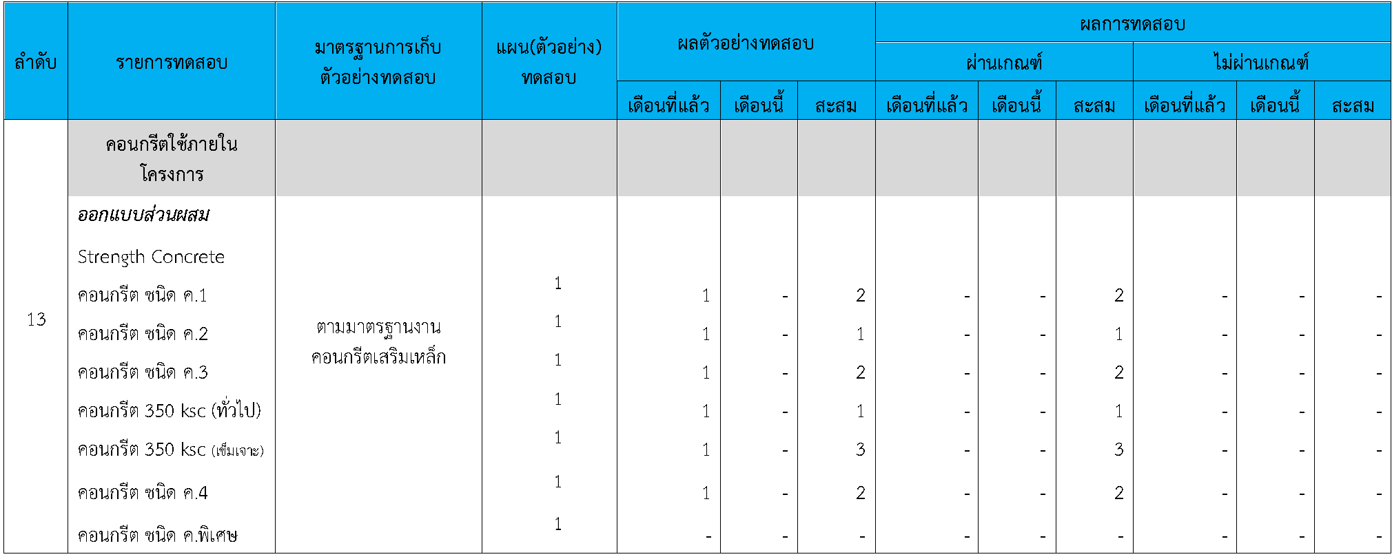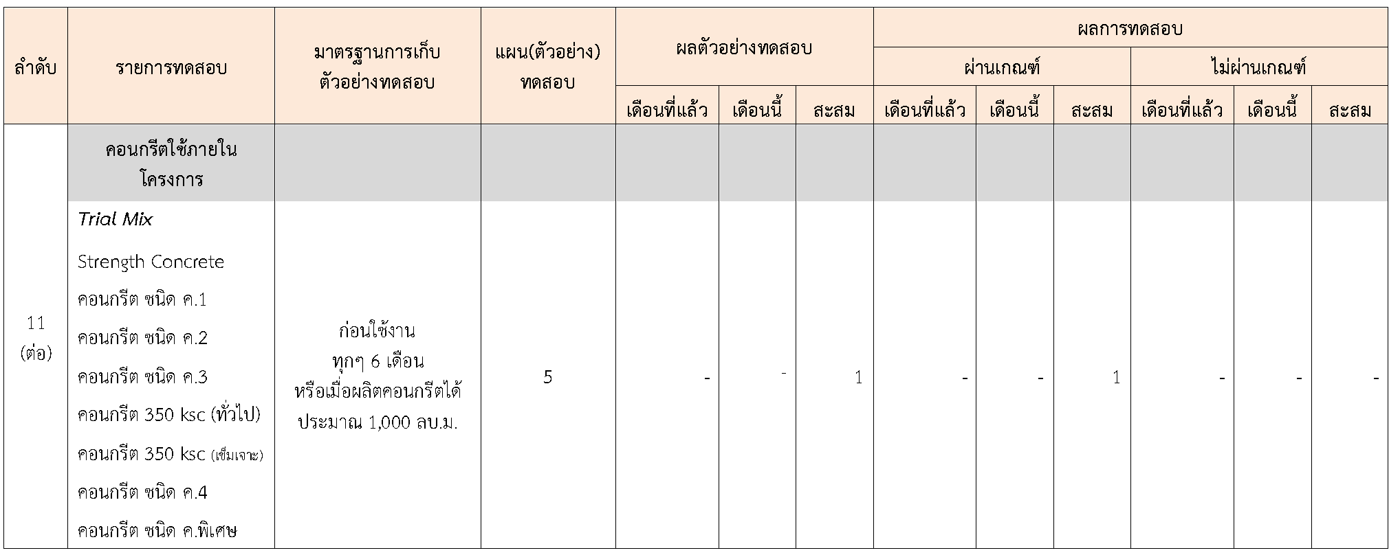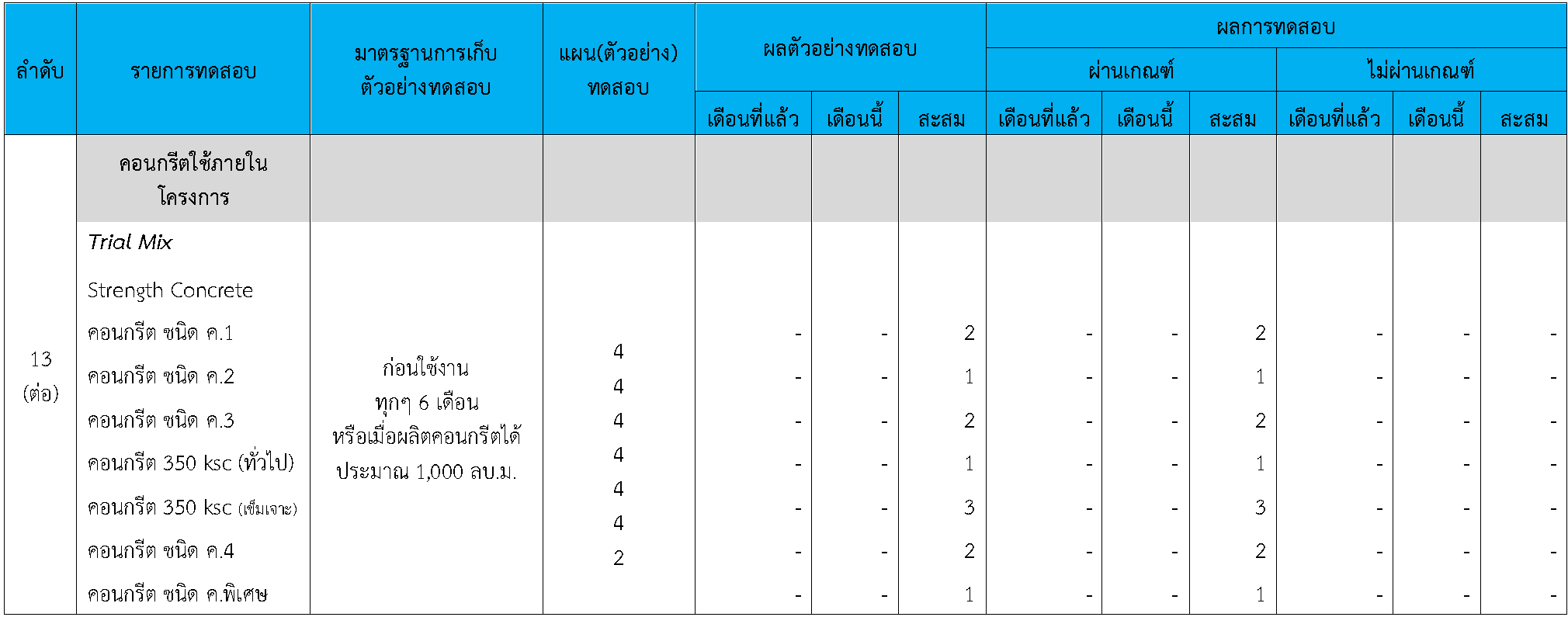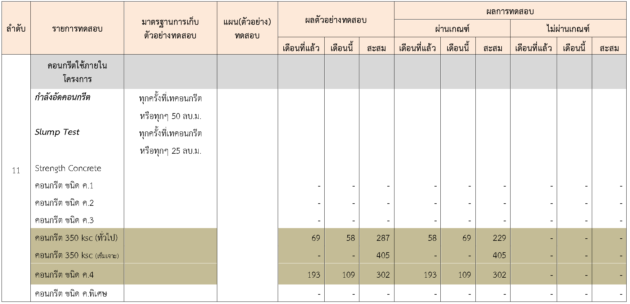 ในระหว่างวันที่ 1-30พฤศจิกายน 2563 ผู้ว่าจ้างได้เสนอหนังสือขออนุมัติใช้วัสดุถึงที่ปรึกษา โดยที่ปรึกษาได้ตรวจสอบวัสดุดังกล่าวมีผลทดสอบดังตาราง