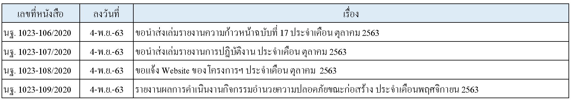ในการดำเนินงานควบคุมงานก่อสร้าง ได้มีการจัดส่งเอกสารหนังสือต่างๆ ระหว่างกรมทางหลวงชนบท ที่ปรึกษา และผู้รับจ้างดังนี้