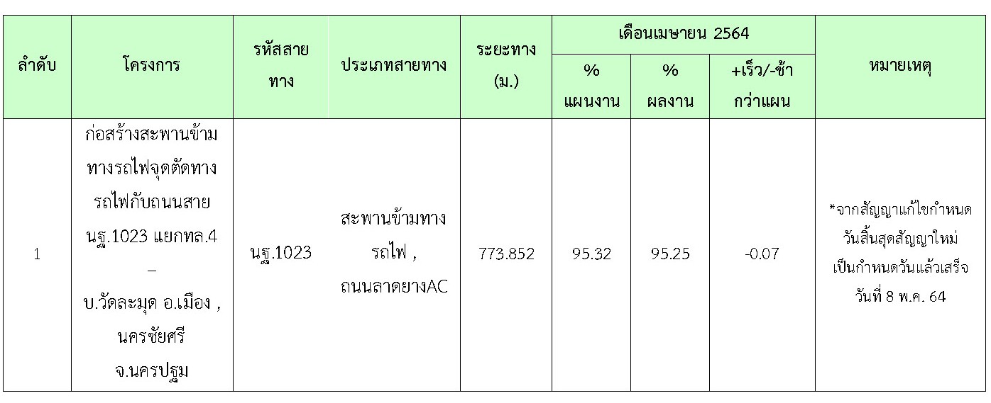 ในเดือน เมษายน2564 ที่ปรึกษาได้ปฏิบัติงานควบคุมงานก่อสร้างโครงการ สรุปการดำเนินงานได้ดังนี้