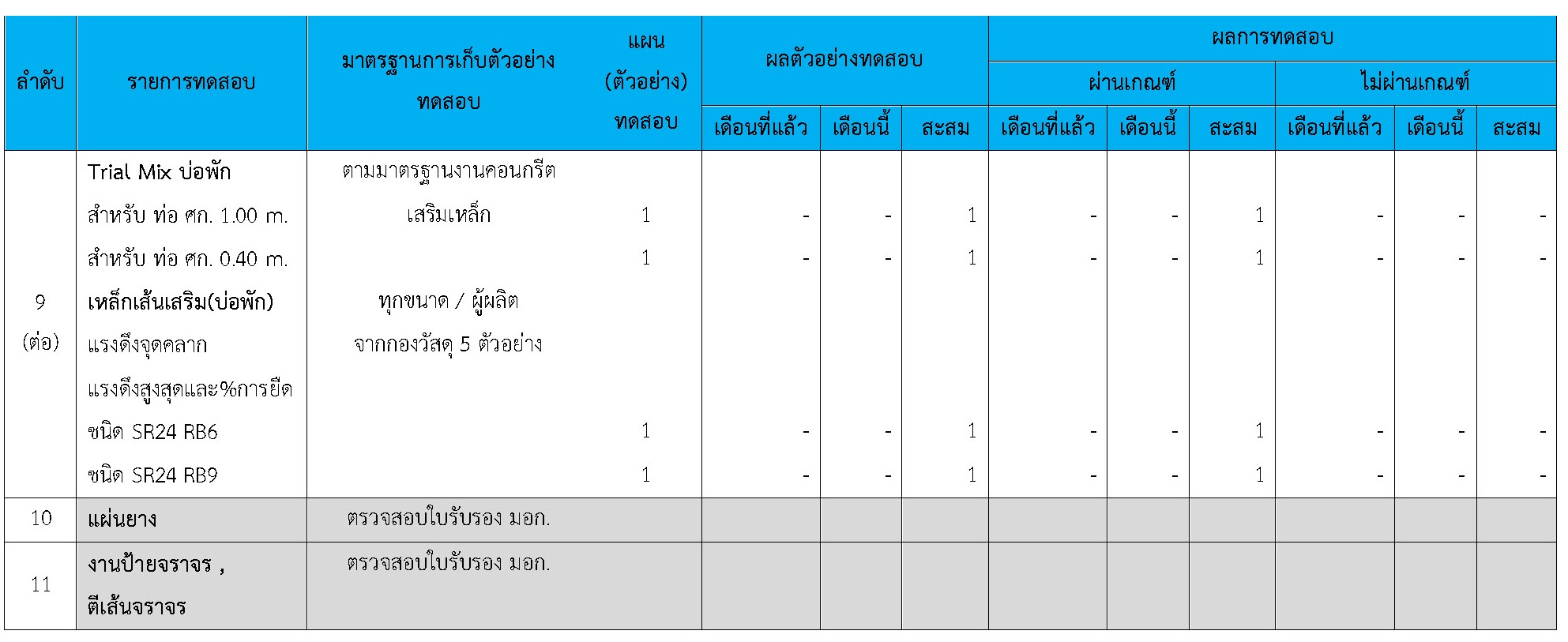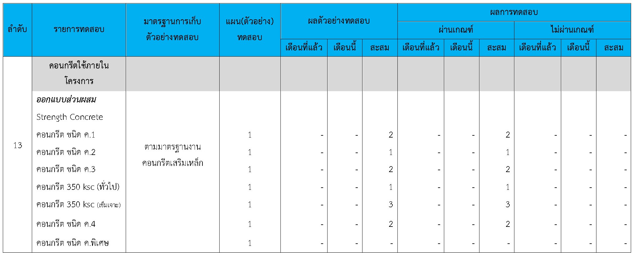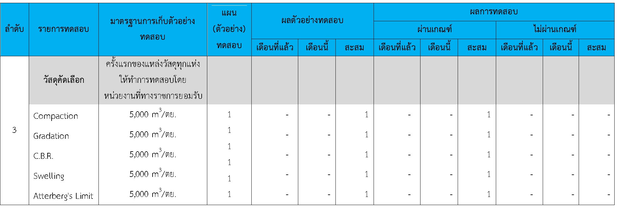 ในระหว่างวันที่ 1-30 เมษายน 2564ผู้ว่าจ้างได้เสนอหนังสือขออนุมัติใช้วัสดุถึงที่ปรึกษา โดยที่ปรึกษาได้ตรวจสอบวัสดุดังกล่าวมีผลทดสอบดังตาราง